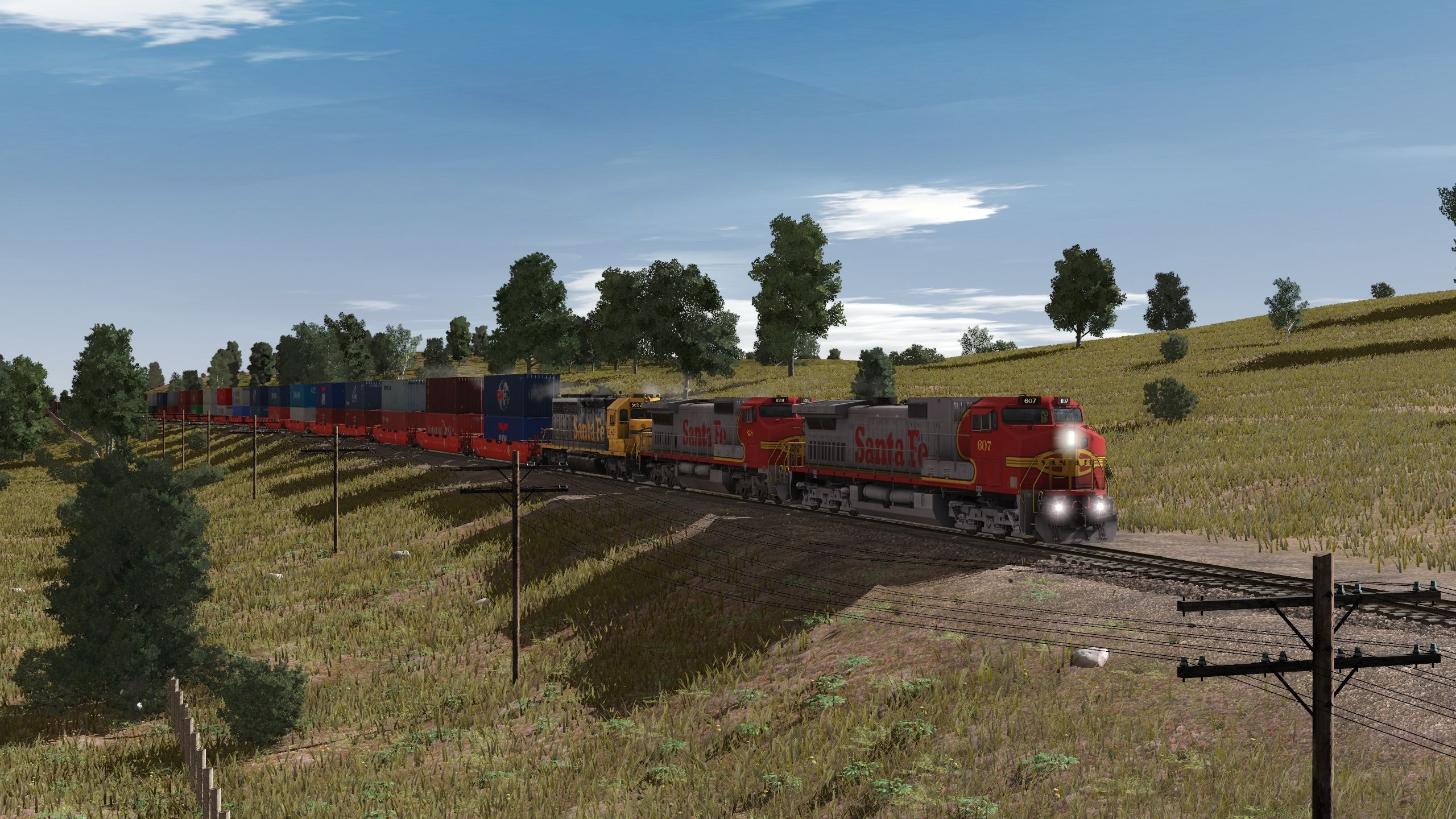 Posted by: epa | Posted:2019-11-05 22:24:59 Caption: Tags: Trainz Railroad Simulator 2019, Heart of Illinois, ATSF C44-9W, ATSF C40-8W, ATSF SD45-2 blue/yellow warbonnet, ATSF 48 Husky Stack