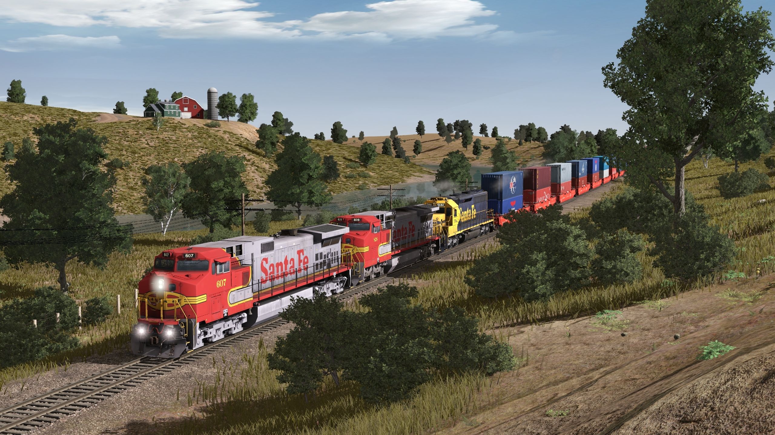 Posted by: epa | Posted:2019-11-05 22:25:11 Caption: Tags: Trainz Railroad Simulator 2019, Heart of Illinois, ATSF C44-9W, ATSF C40-8W, ATSF SD45-2 blue/yellow warbonnet, ATSF 48 Husky Stack