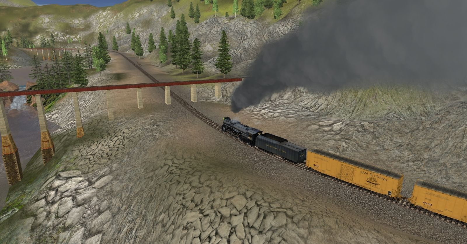 Tags: Trainz: A New Era, Kickstarter County, Default, C&O Kanawha K-4 Steam, Custom 60' ACF Boxcar - Sam & Euan's, C&O Kanawha K-4 Tender, ATSF Ce-11 Caboose