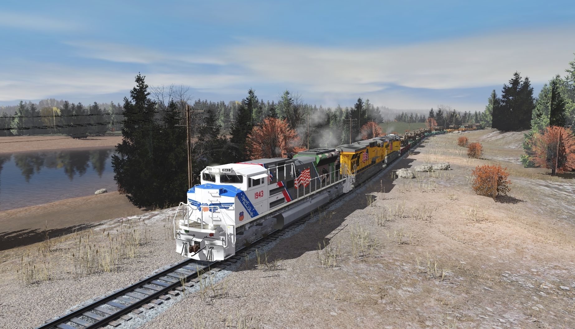 Tags: Trainz Railroad Simulator 2019, Legacy of the Burlington Northern v2 2.0, Default, UP 1943 Spirit of the Union Pacific, GE ES44AC UP 7600-8111 new, EMD SD70ACe UP #8485, Flatcar 89 ft DODX 4 axle dk red, Flatcar 89 ft DODX 4 axle lt green, Flatcar 89 ft DODX 4 axle lt green wood deck, Flatcar 89 ft DODX 4 axle YELLOW, Flatcar 89 ft DODX 4 axle YELLOW wood deck, Flatcar 89 ft DODX 6 axle dk GREEN, Flatcar 89 ft DODX 6 axle dk GRN wood deck, Flatcar 89 ft DODX 6 axle dk red
