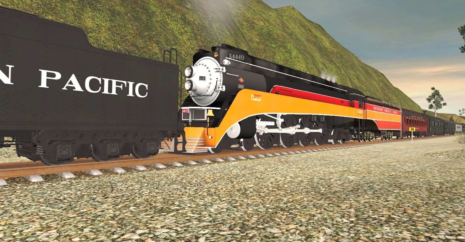 Tags: Trainz Railroad Simulator 2019, Kickstarter County 2, Default, SP GS-4 Engine War Baby, SP GS-4 Engine Daylight, SP GS-8 Tender, USA SP Class GS-4 Tender, SRC Coach Warren F Benner, Southern Coach 1067 Archroof, Southern Coach 726 Man O War, Southern Coach 829 Lounge, Southern Observation 1056 Lookout Mountain, RMRX 'Red Leaf' Coach, RMRX 'Silver Leaf' Glacier Dome