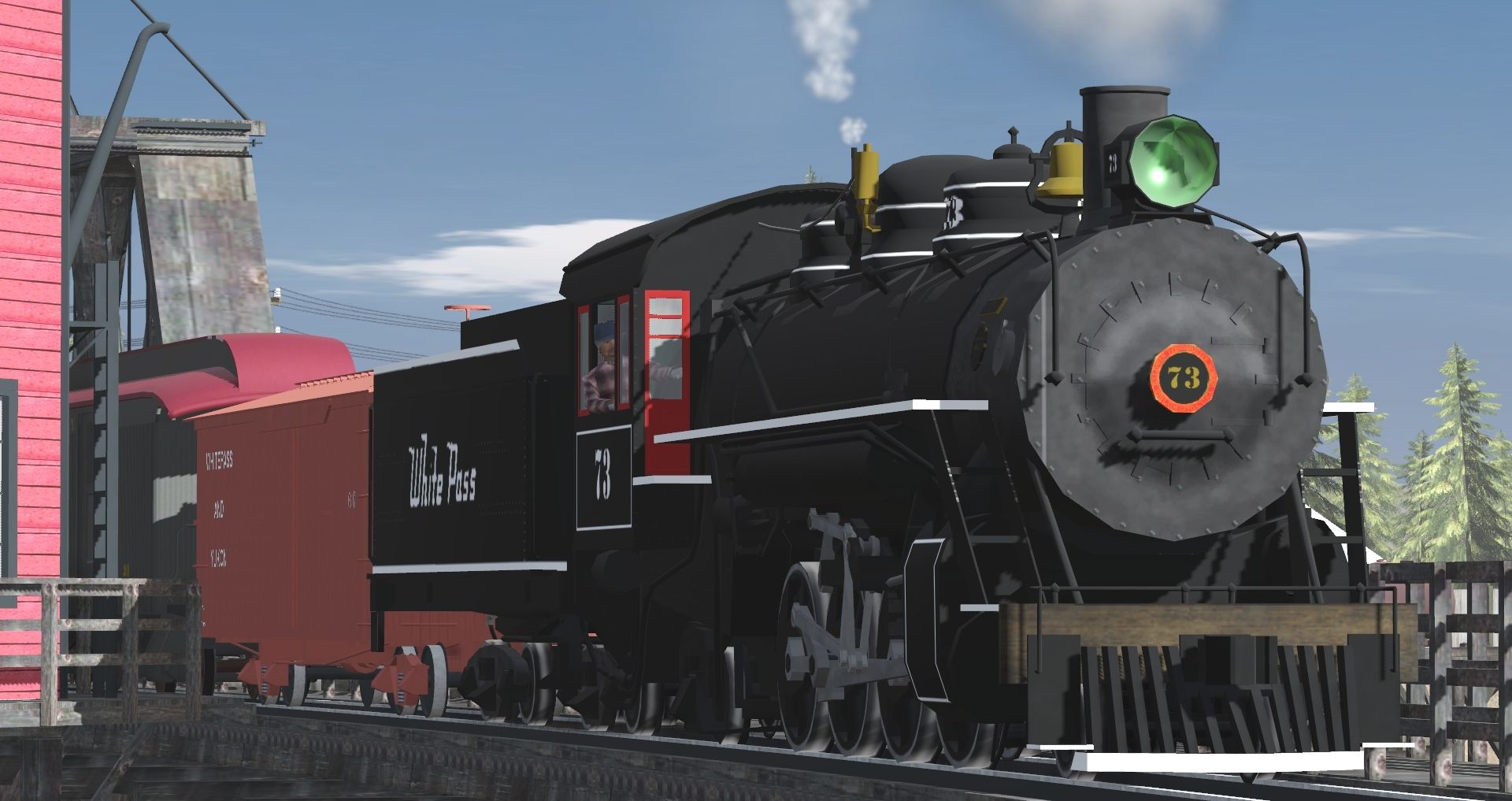 Tags: Trainz Railroad Simulator 2019, White Pass & Yukon RR vers 1.1, Flying Cam, 36NG White Pass and Yukon Route 2-8-2 #73, 36NG White Pass and Yukon Route 2-8-2 #73 Tender, WP&Y_Boxcar_5, WPY baggage car 201, WPY car 214, WPY car 216, WPY car 218, WPY car 220, WPY car 222, WPY car 224