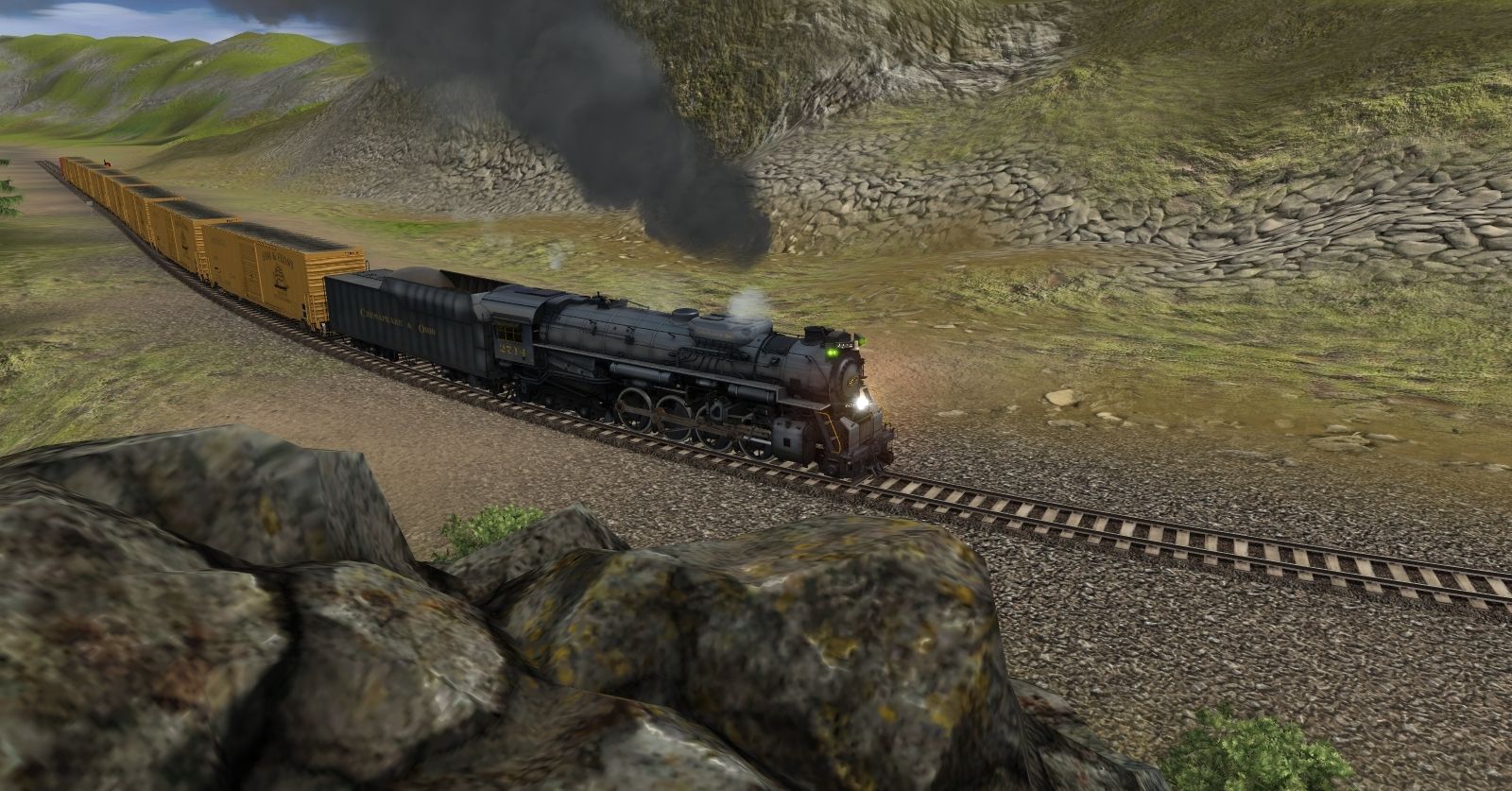 Tags: Trainz: A New Era, Kickstarter County, Default, C&O Kanawha K-4 Steam, C&O Kanawha K-4 Tender, Custom 60' ACF Boxcar - Sam & Euan's, ATSF Ce-11 Caboose