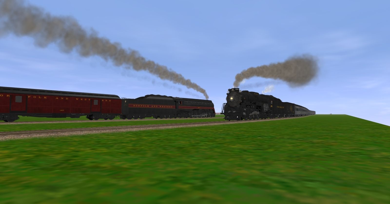 Tags: Trainz: A New Era, New Route, Default, PM Berkshire Engine V2, N&W J Class Engine, SP GS-4 Engine Daylight V3, N&W NS Powhatan Arrow 02 P2 Divided Coach 511, N&W Tool Car #1407, N&W J Class Tender, PM Berkshire Tender, PM Aux Tender MSTX5000, SP Lightweight Cascade Baggage-Mail, N&W Powhatan Arrow 06 D1 Diner 494, SP Lightweight Cascade 12 DBR