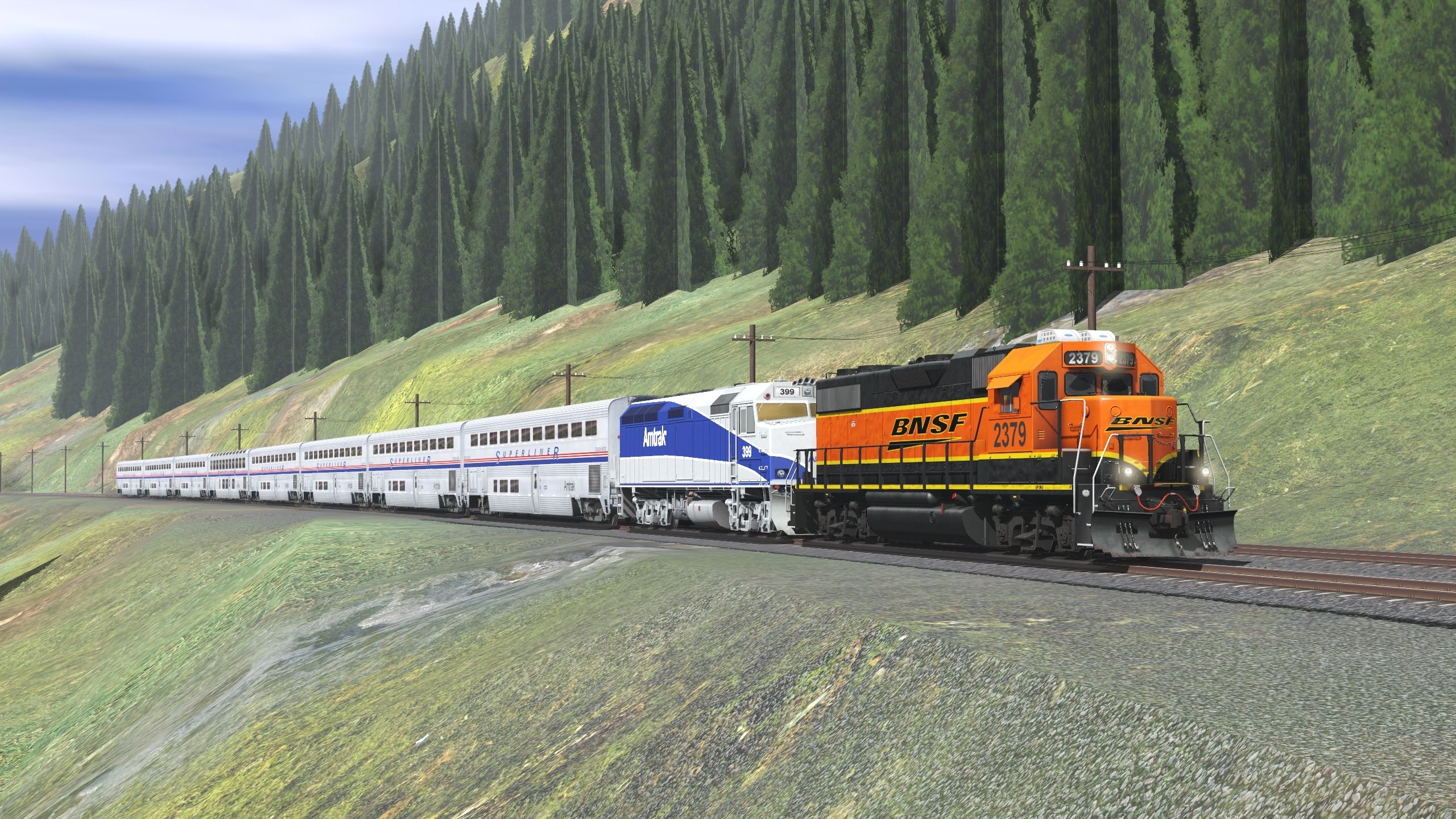 Tags: Trainz Railroad Simulator 2019, Marias Pass Route X - 2, Amtrak Rescue, GP38-2 BNSF modern HP01T, Amtrak F40PH blue stripes HP, Superliner II Coach 34120, Superliner II Sightseer Lounge 33049