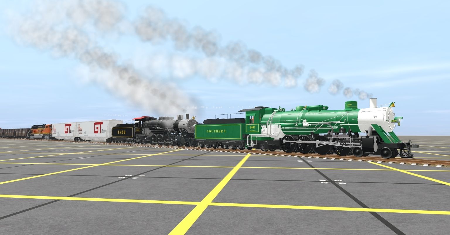 Tags: Trainz Railroad Simulator 2019, Bullet Train Grade Crossing 2, Default, 412 Southern #1409 4-8-2 Mountain Type V2.0, Frisco 1522 4-8-2 'Mountain Type, EMD SD70ACe BNSF H3, 412 Southern #1409 Mountain Tender, Frisco 1522 Tender, #54'GTW(LARS), EL 100 Ton Hopper, EEC (Ex-VAMD) 50ft Boxcar FMC, GBCX Cylindrical Hopper, MWGX (dirty) Cylindrical Hopper, PROX 23000 gal Funnel-Flow tank car black