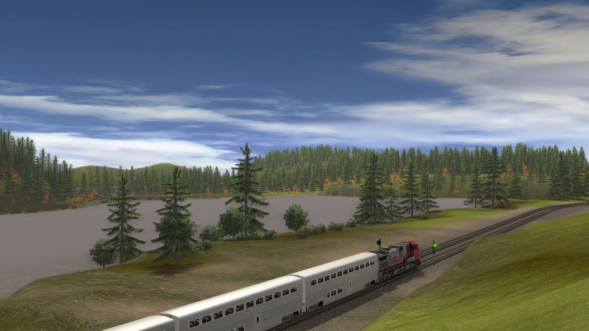 Tags: Trainz: A New Era, Kickstarter County, ATSF-BNSF Dash 9-44CW, ATSF Hi-Level Sky Lounge, ATSF Hi-Level Diner, ATSF Hi-Level Chair Car, Bulkhead Flatcar BNSF 62 ft
