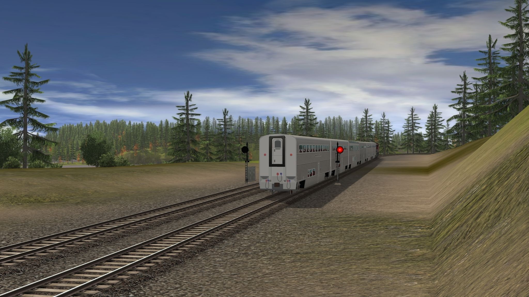 Tags: Trainz: A New Era, Kickstarter County, ATSF-BNSF Dash 9-44CW, ATSF Hi-Level Sky Lounge, ATSF Hi-Level Diner, ATSF Hi-Level Chair Car, Bulkhead Flatcar BNSF 62 ft