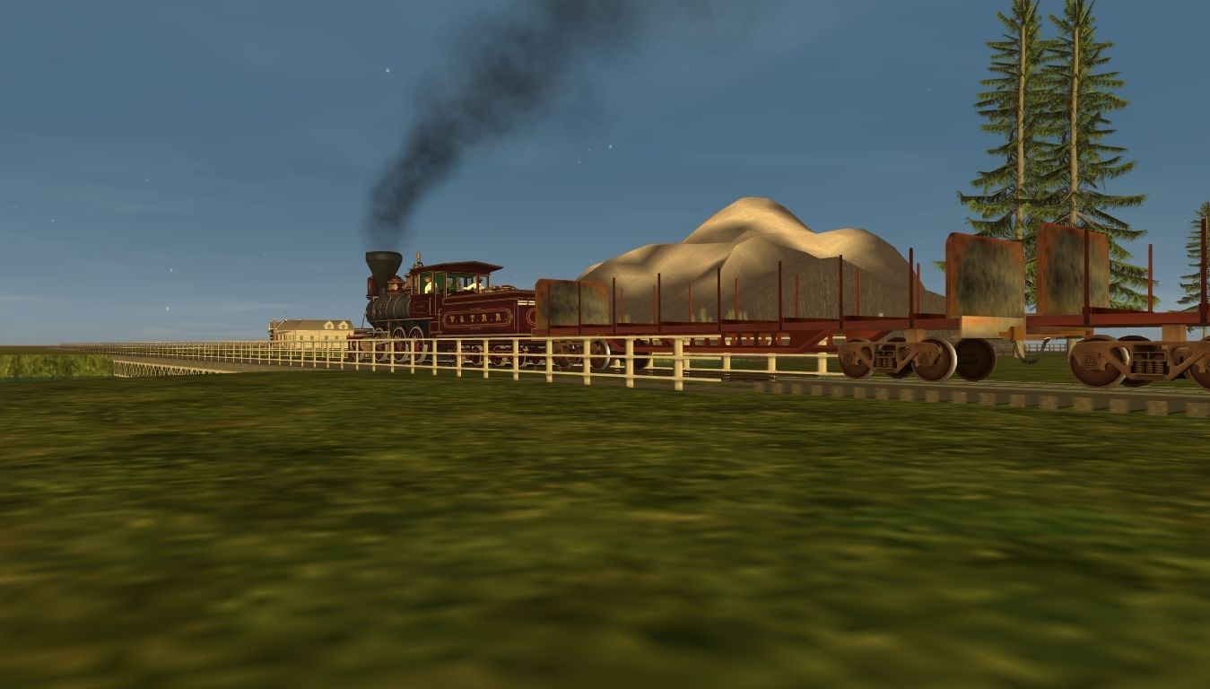Tags: Trainz: A New Era, New Route, Default, V & T loco no 20(Tahoe) ca 1870's, Log Wagon Short Knuckle, V & T loco no 20 tender ca 1870's, Coach C&O George Washington 735