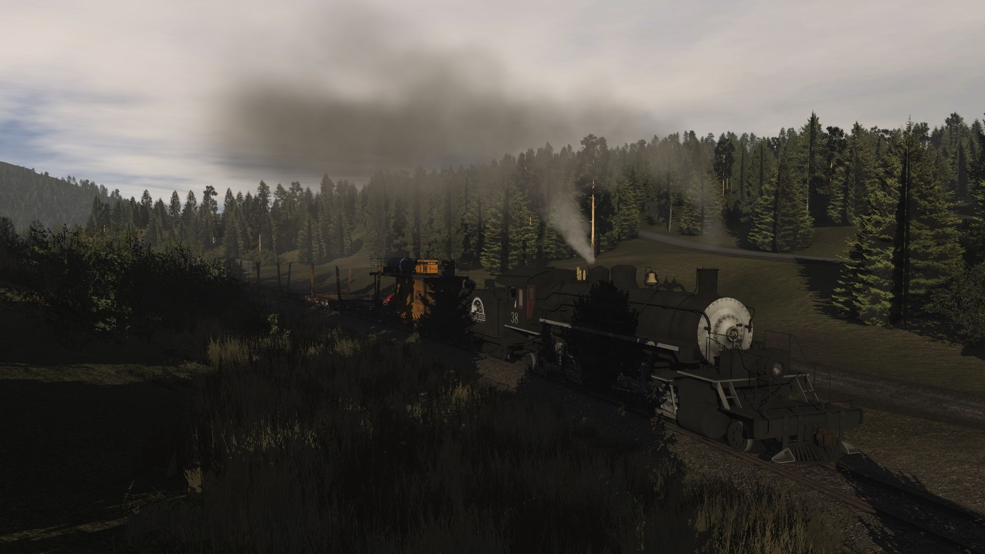 Tags: Trainz Railroad Simulator 2019, Eagle River Railway, 04 Thursday - Camp A Run-steam, Sierra Railroad #38 JMB, Sierra Railroad #38 tender Eagle River, ERSX 54ft flatcar, ERSX Brake Control Car