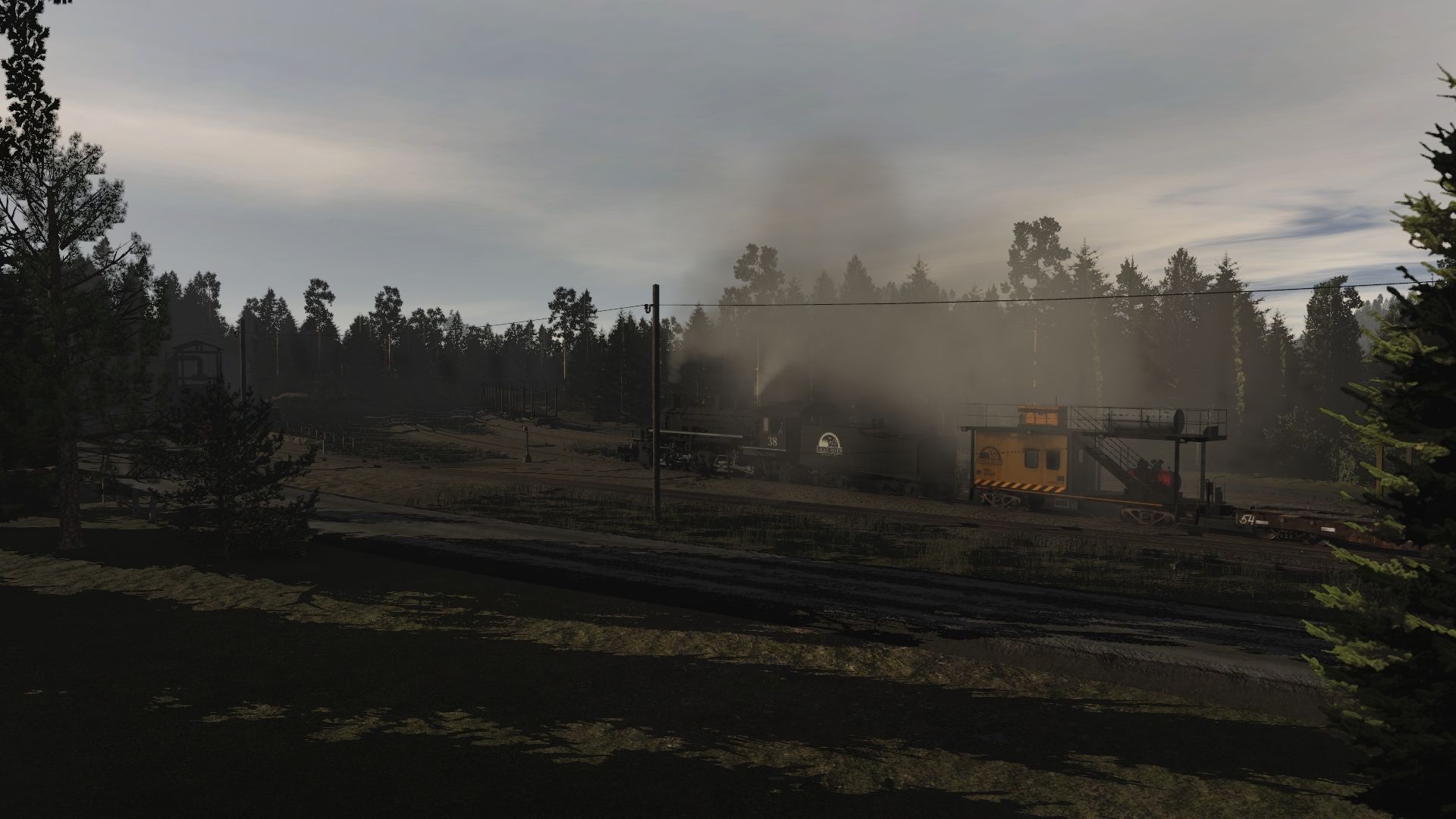 Tags: Trainz Railroad Simulator 2019, Eagle River Railway, 04 Thursday - Camp A Run-steam, Sierra Railroad #38 JMB, ERSX 54ft flatcar, ERSX Brake Control Car, Sierra Railroad #38 tender Eagle River, ERSX 60Ft.9In. woodchip gondola, SVLX Log Rack