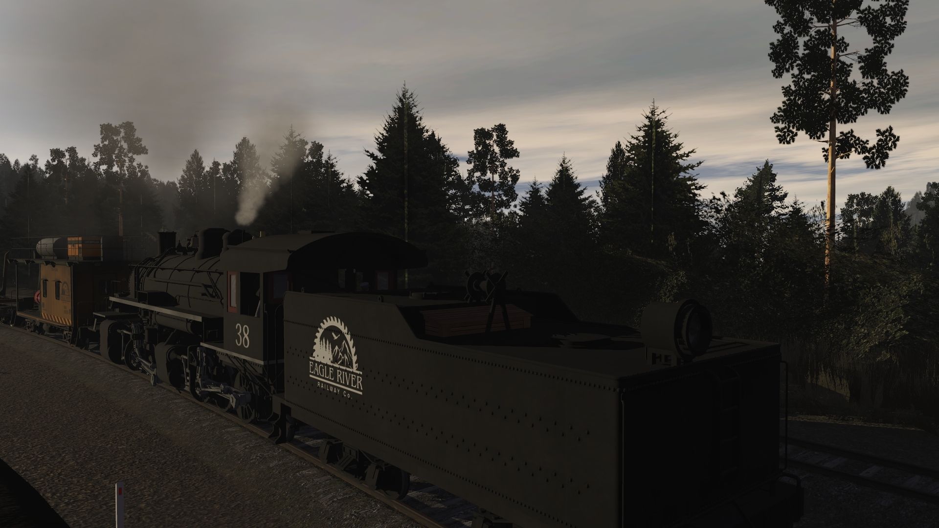 Tags: Trainz Railroad Simulator 2019, Eagle River Railway, 04 Thursday - Camp A Run-steam, Sierra Railroad #38 JMB, Sierra Railroad #38 tender Eagle River, ERSX 54ft flatcar, ERSX Brake Control Car