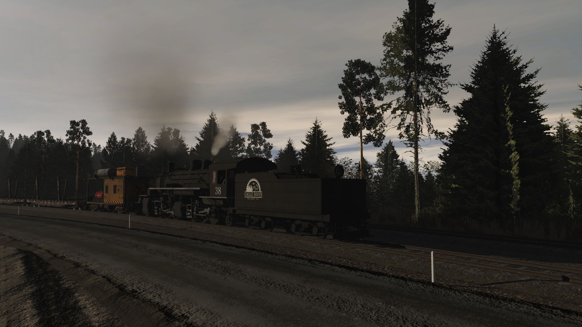 Tags: Trainz Railroad Simulator 2019, Eagle River Railway, 04 Thursday - Camp A Run-steam, Sierra Railroad #38 JMB, Sierra Railroad #38 tender Eagle River, ERSX 54ft flatcar, ERSX Brake Control Car