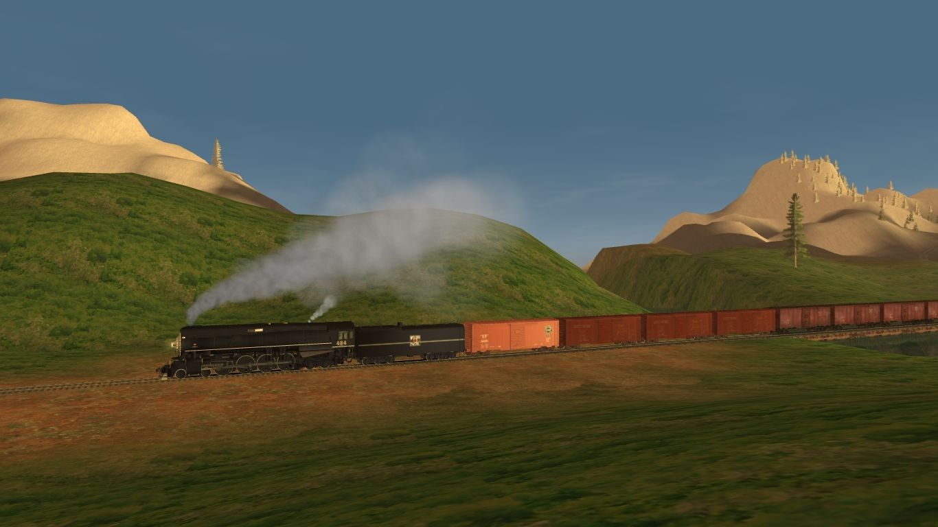 Tags: Trainz: A New Era, New Route, Default, WP GS-64 #484 1944 Wartime Engine, WP GS-64 #484 1945 Wartime Tender, 40ft Boxcar SP 01, 40ft Boxcar UP 01, 40ft Boxcar WP
