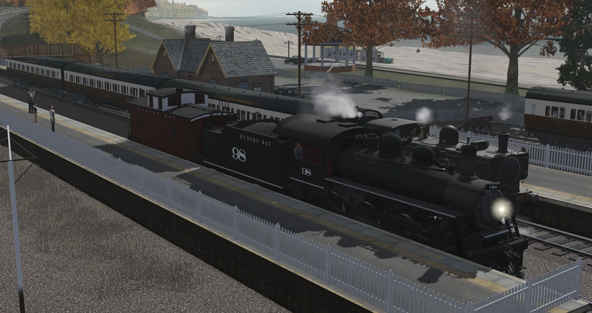 Tags: Trainz Railroad Simulator 2019, Cornish Mainline and Branches - TRS19, HB K1 Engine, GWR 57xx class, HB K1 Tender, HB Van, GWR 1922 3rd St Ives and Penzance lot 1308, GWR (F. Bendle) 20T Mineral coal load, GWR 1930 Multivan TRS2004, GWR 1930 Multivan grey roof TRS2004, GWR (F. Bendle) 20T Mineral empty, GWR dining car 1906 H13, GWR E27 compo 1912 w num