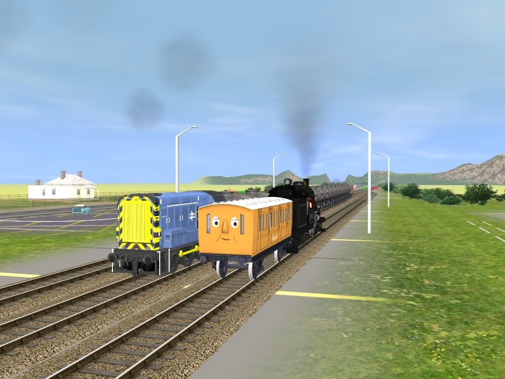 Caption: its is a hot day and roly's train been held up for hour and here comes bowny the stinky engine