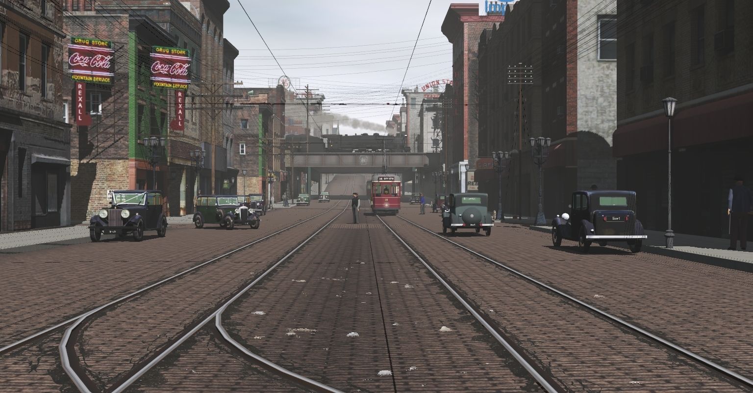 Tags: Trainz Railroad Simulator 2019, PRR pitts steve, Default, Huddersfield Tram #28, PRR I1sa Engine Pre-War, PRR I1sa Tender Coast to Coast Post-War, PRR H21a Hopper, PRR N5c Caboose 2, , , Steel Heavyweight Coach Green
