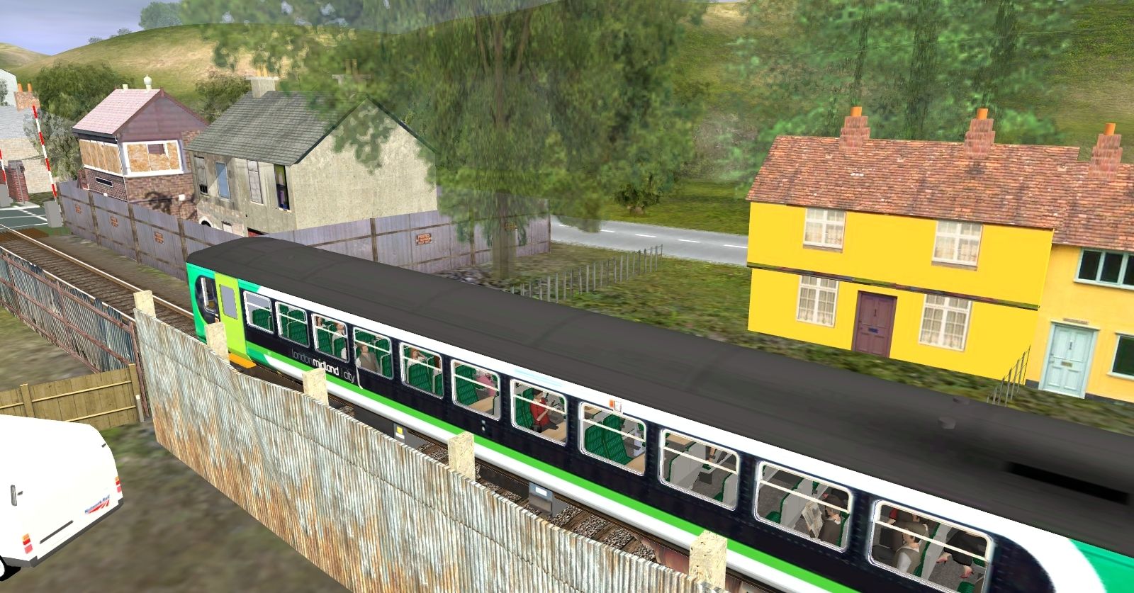 Caption: An LM 153 creeps past the derelict signal box and adjoining houses on approach to Ashton Fields.