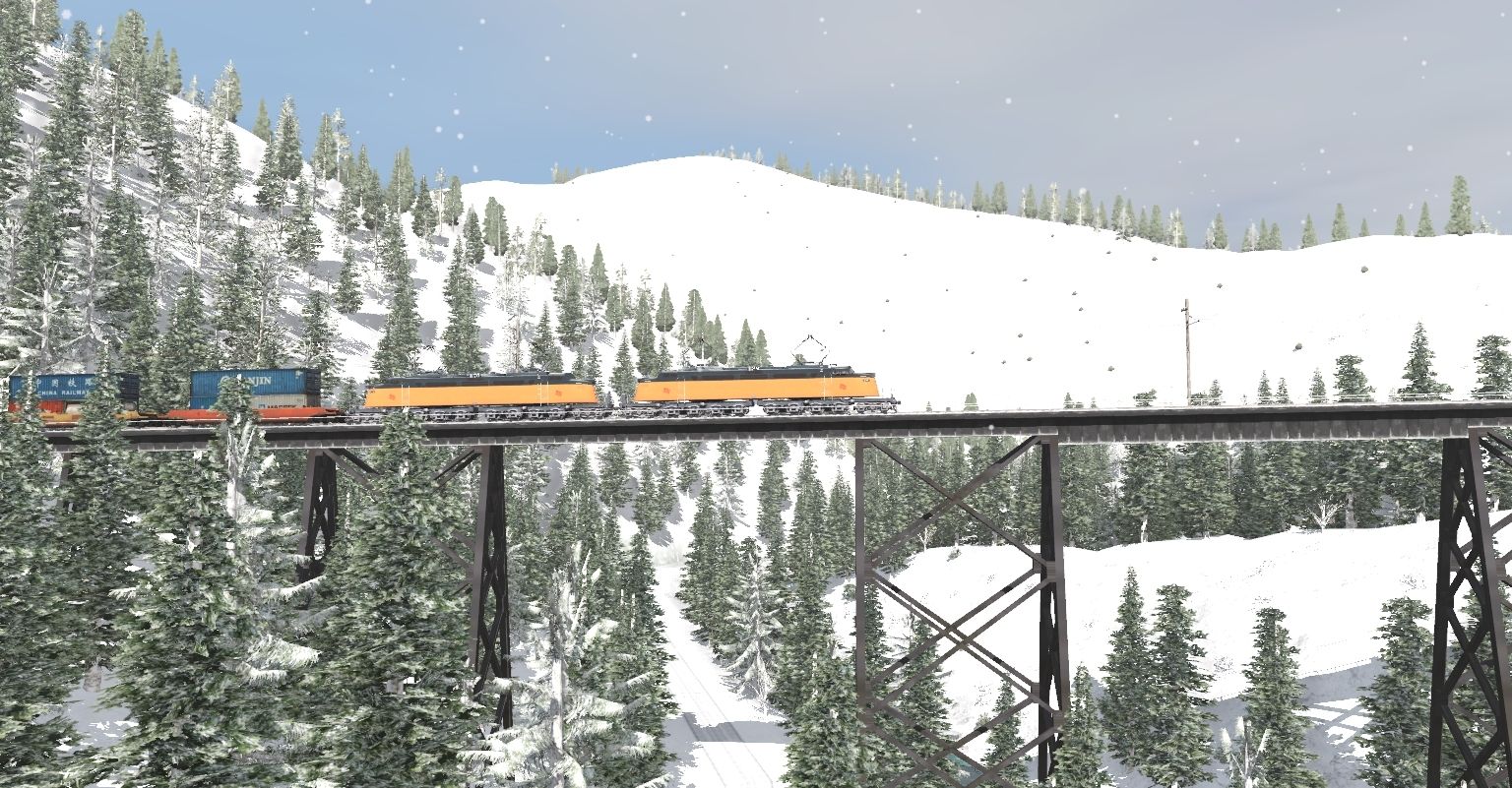 Caption: Two liitlle joes Pull a stack train upgrade over Stetson Bridge.