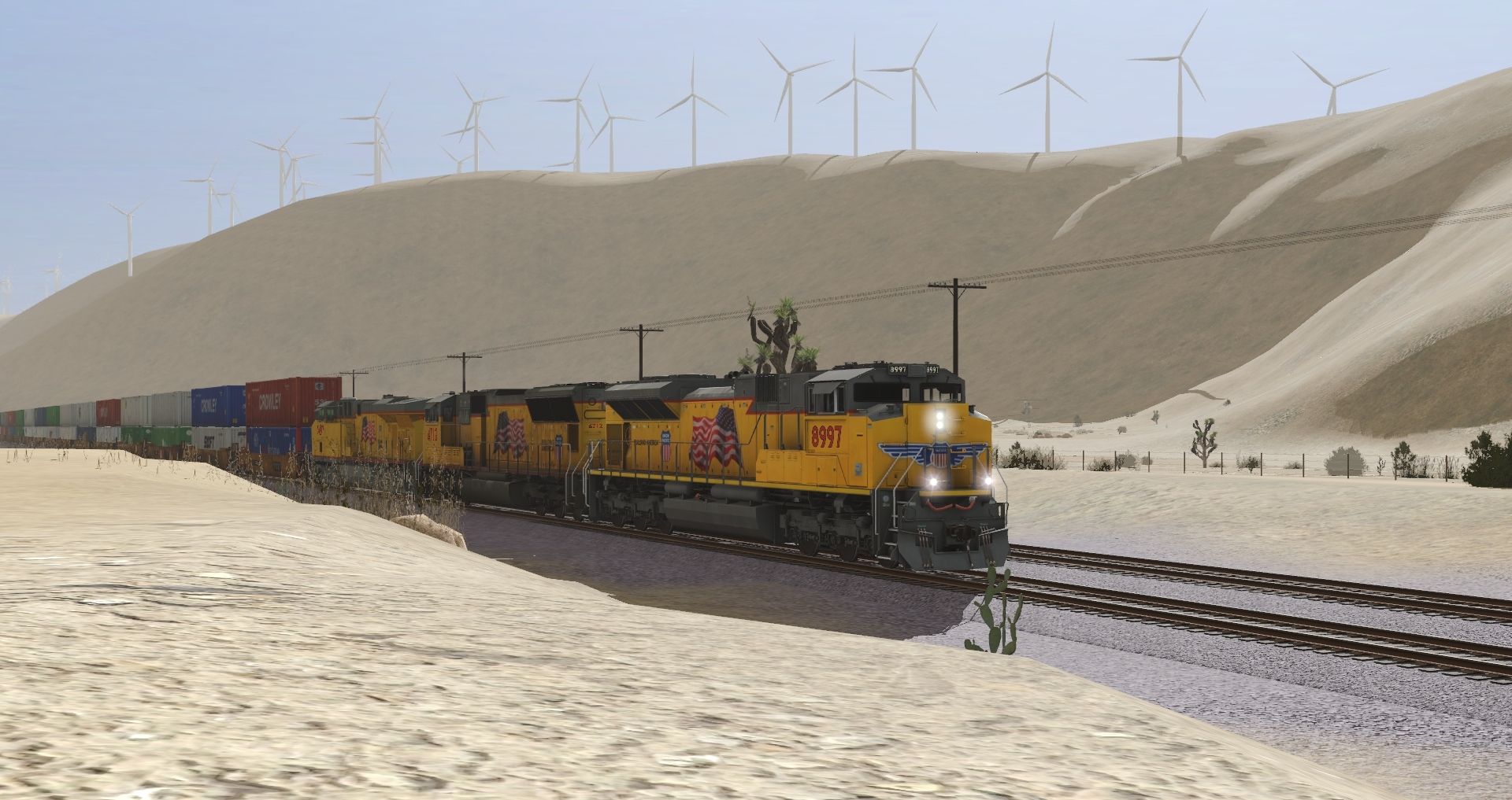 Tags: Trainz Railroad Simulator 2019, Mojave Sub Division, UP SD70ACe (late), UP SD70M Flared Radiator, UP ES44AC, TTX weathered 53 Husky Stack