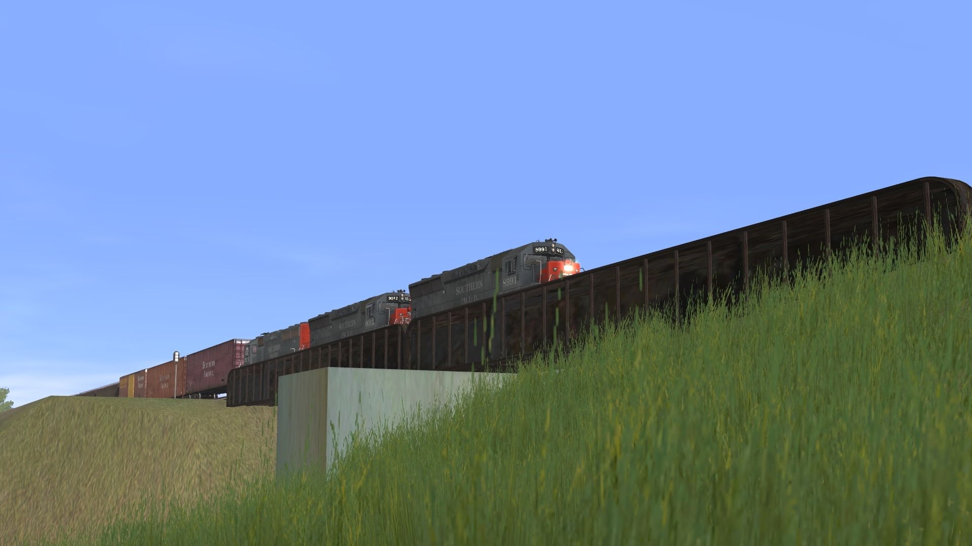Tags: Trainz: A New Era, river, Default, SP SD45, SP GP40-2, SP 60Ft.9In. woodchip gondola, SP PC&F 6033, SRCX #4249 3 Bay ACF, SSW Centerflow 3 Bay long hatch, TILX 23000 gal Funnel-Flow tank car, TSCX 20800 gal tank car, UP #12049 3 Bay ACF, UP Centerflow 3 Bay long hatch, UP 60' ACF Boxcar
