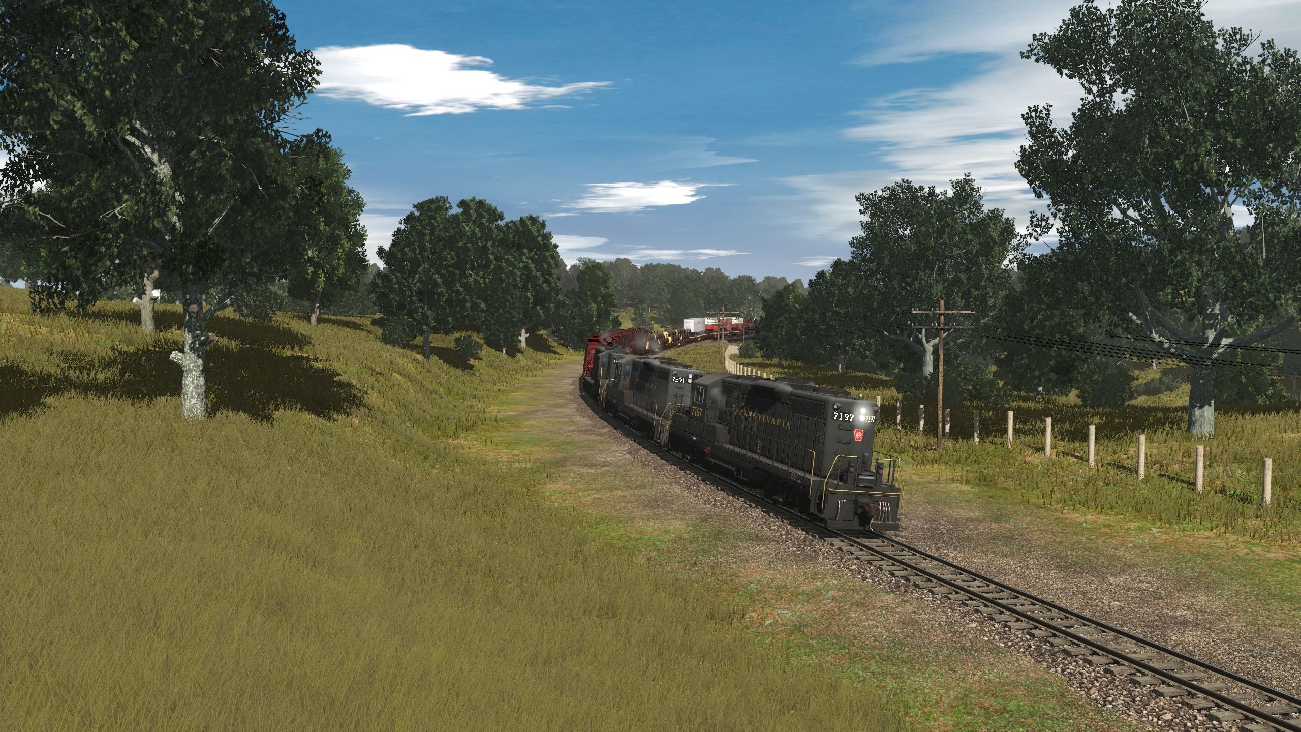 Tags: Trainz Railroad Simulator 2019, Heart of Illinois, Default, PRR GP9 late, PRR GP9 early, PRR Flatcar F30, PRR Tanker AA (Tuscan Red), PRR Tanker AA (Tuscan Red Arch Bar), PRR Tanker AA (Arch Bar), PRR Tanker AA, PRR Boxcar X50a, PRR Flatcar F30 Staves, Caboose-Center Cupola-N&W