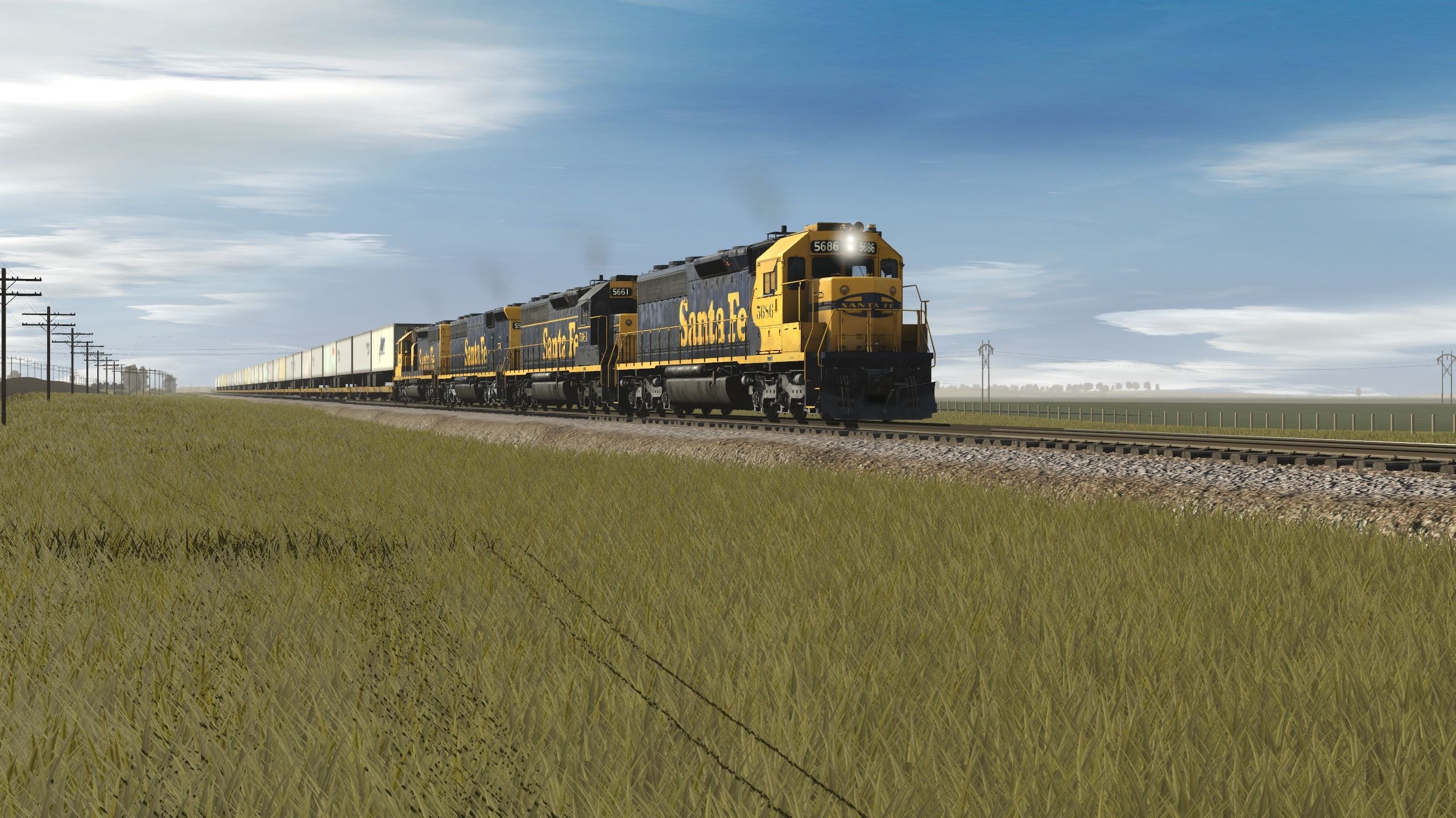 Tags: Trainz Railroad Simulator 2019, Heart of Illinois, Default, ATSF SD45-2 blue/yellow warbonnet, ATSF SD45-2 blue/yellow stripe, ATSF SD45-2B, ATSF SD40-2 2a, TTX Patched 89ft TOFC Flatcar