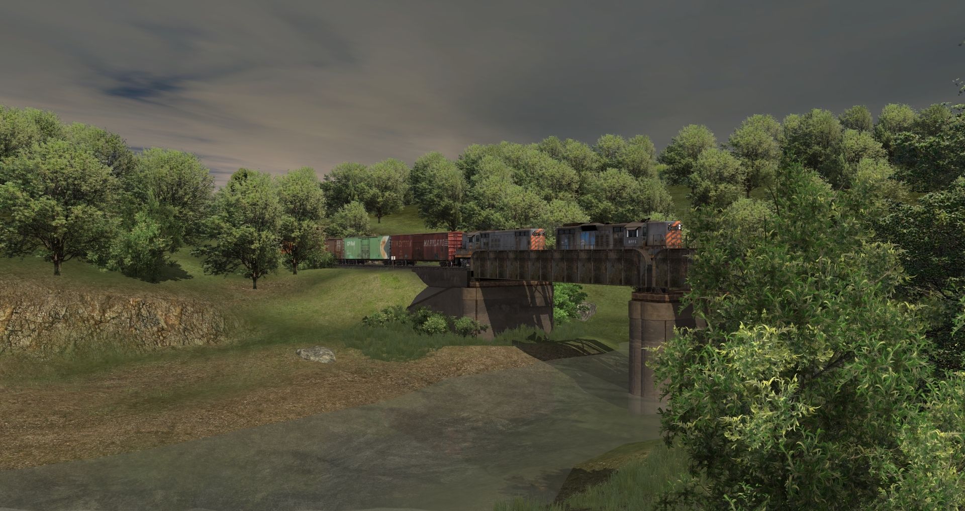 Tags: Trainz: A New Era, Coal Country, RP&P Break-In, RPPX GP18 (ex-CR), RPPX GP9 high, 50ft Boxcar WM 26634, 50ft Boxcar CP 85268, 50ft Boxcar SCL 24822, 50ft Boxcar DRGW 63119, 50ft Boxcar CV 600178, GATX 13818 gal tank car, 50ft Boxcar SOU 41080, 60ft Boxcar CR 218134, RPPX 60Ft.9In. scrap gondola