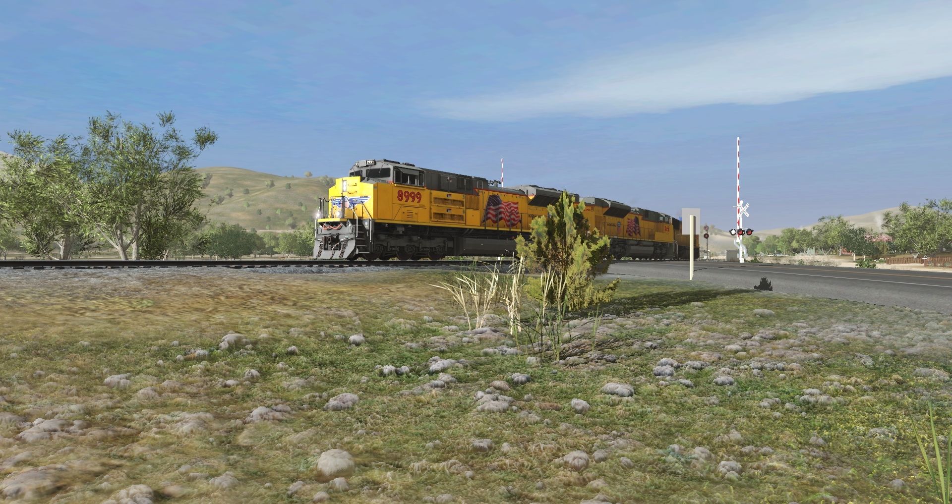 Tags: Trainz Railroad Simulator 2019, TRS19 Mojave Sub Division, UP SD70ACe (late), UP SD70ACe, UP SD70M Letters, UP ES44AC, UP GP9 late (weathered), TTX weathered 53 Husky Stack, Bethgon BNSF, UPFE PCF 57' Reefer white dirty