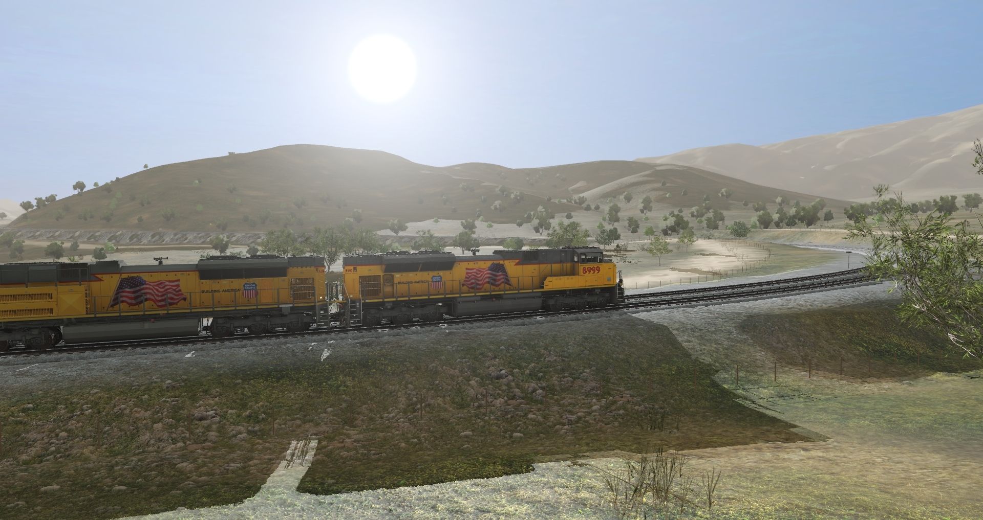 Tags: Trainz Railroad Simulator 2019, TRS19 Mojave Sub Division, UP SD70ACe, UP SD70ACe (late), UP SD70M Letters, UP ES44AC, TTX weathered 53 Husky Stack