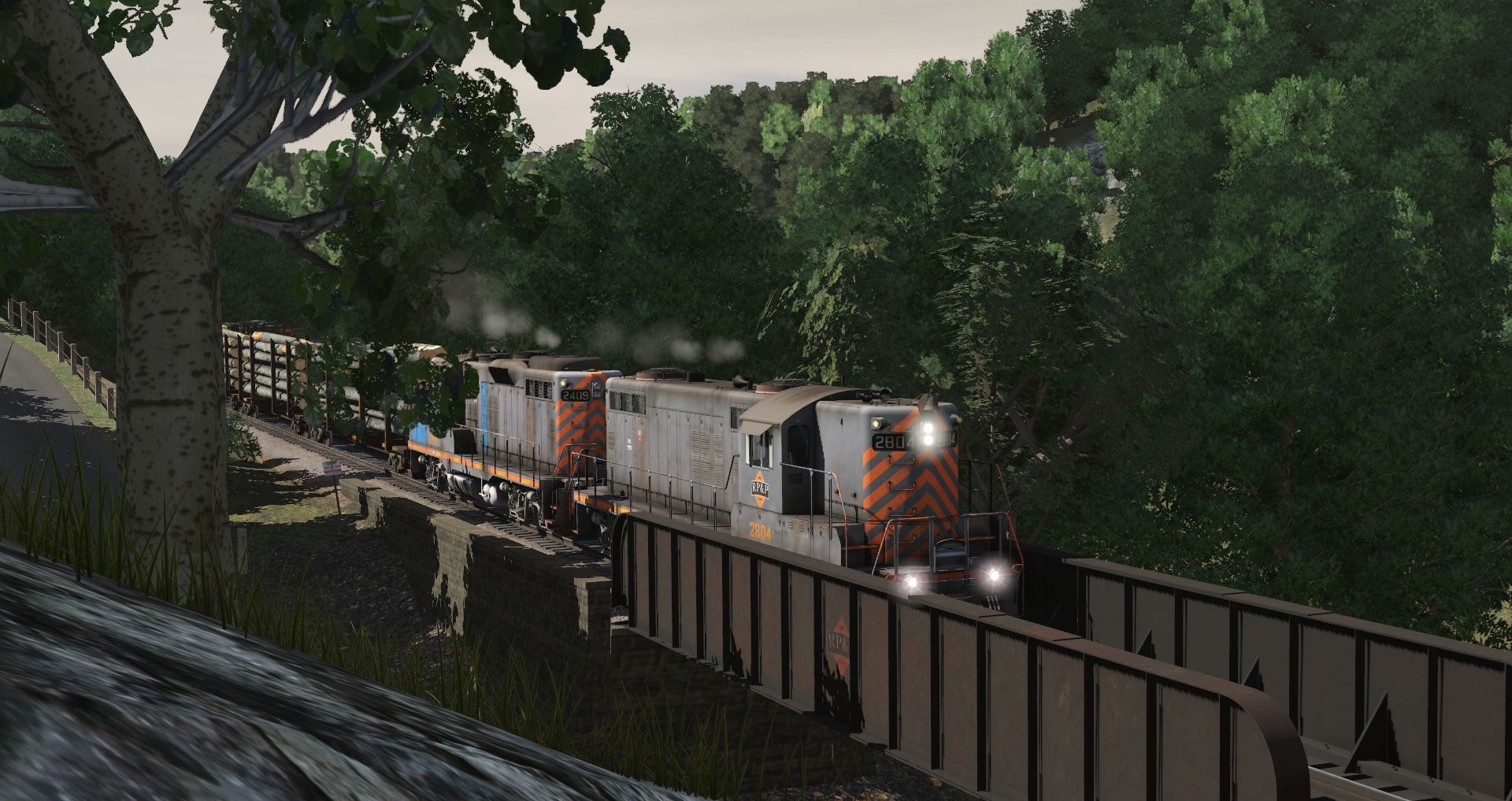 Tags: Trainz Railroad Simulator 2019, Coal Country, 02 - Log Service, RPPX GP9 high, RPPX GP18 (ex-CR), SVLX Log Rack Yellow, RPPX Transfer Caboose, RPPX 100 Ton Hopper