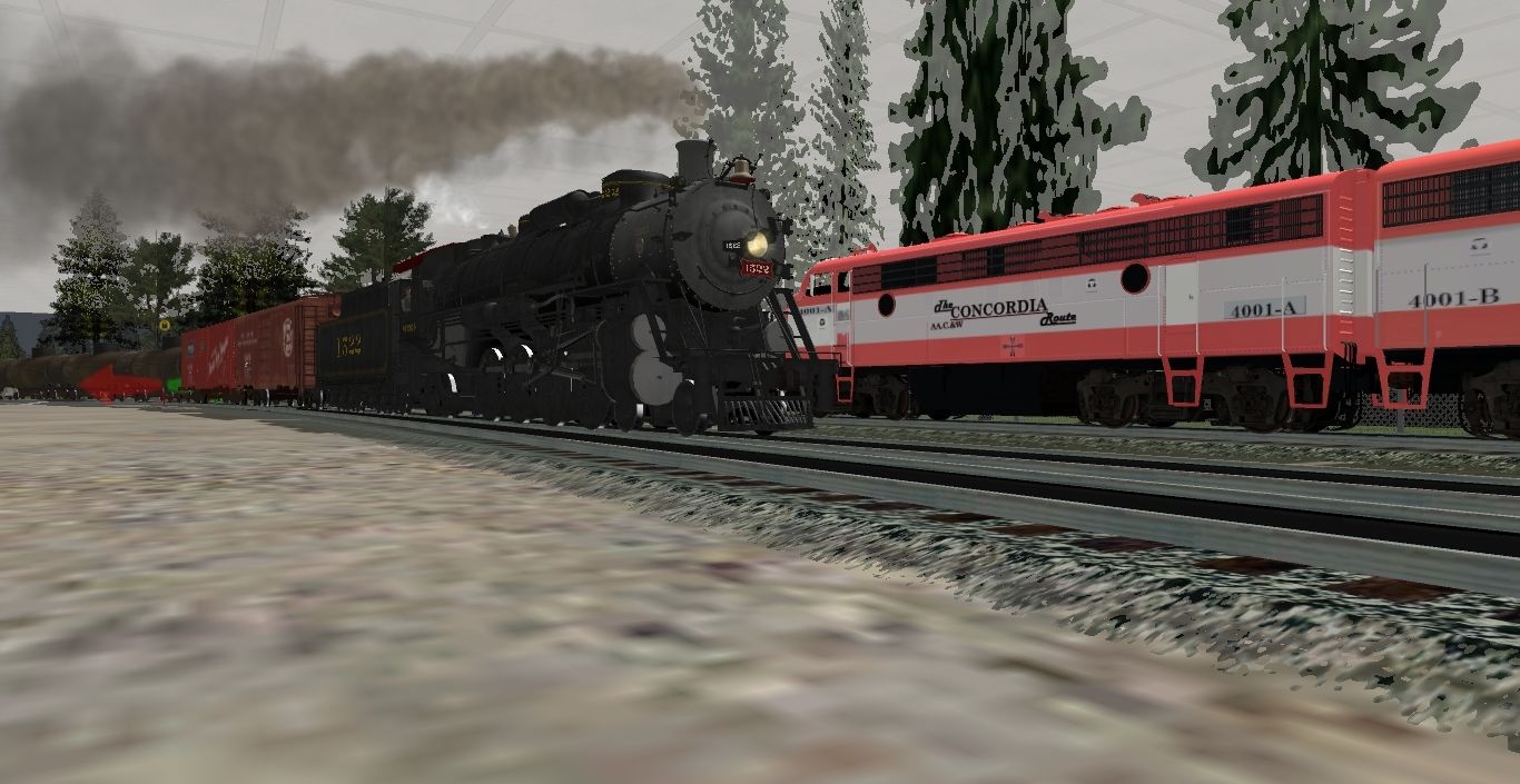 Tags: Trainz: A New Era, Southern Pine & Nathan's Pass, Default, Frisco 1522 Engine, Concordia Route F7B 4001B, Concordia Route F7A #4001, Concordia Route F7A #4000, Frisco 1065 Engine, EMD GP38 MoPac #2005, EMD GP38 MoPac #2002, EMD GP40 MoPac #612, Frisco USRA1 Mikado Engine V2, Frisco 1630 Engine, Frisco 4501 'Meteor