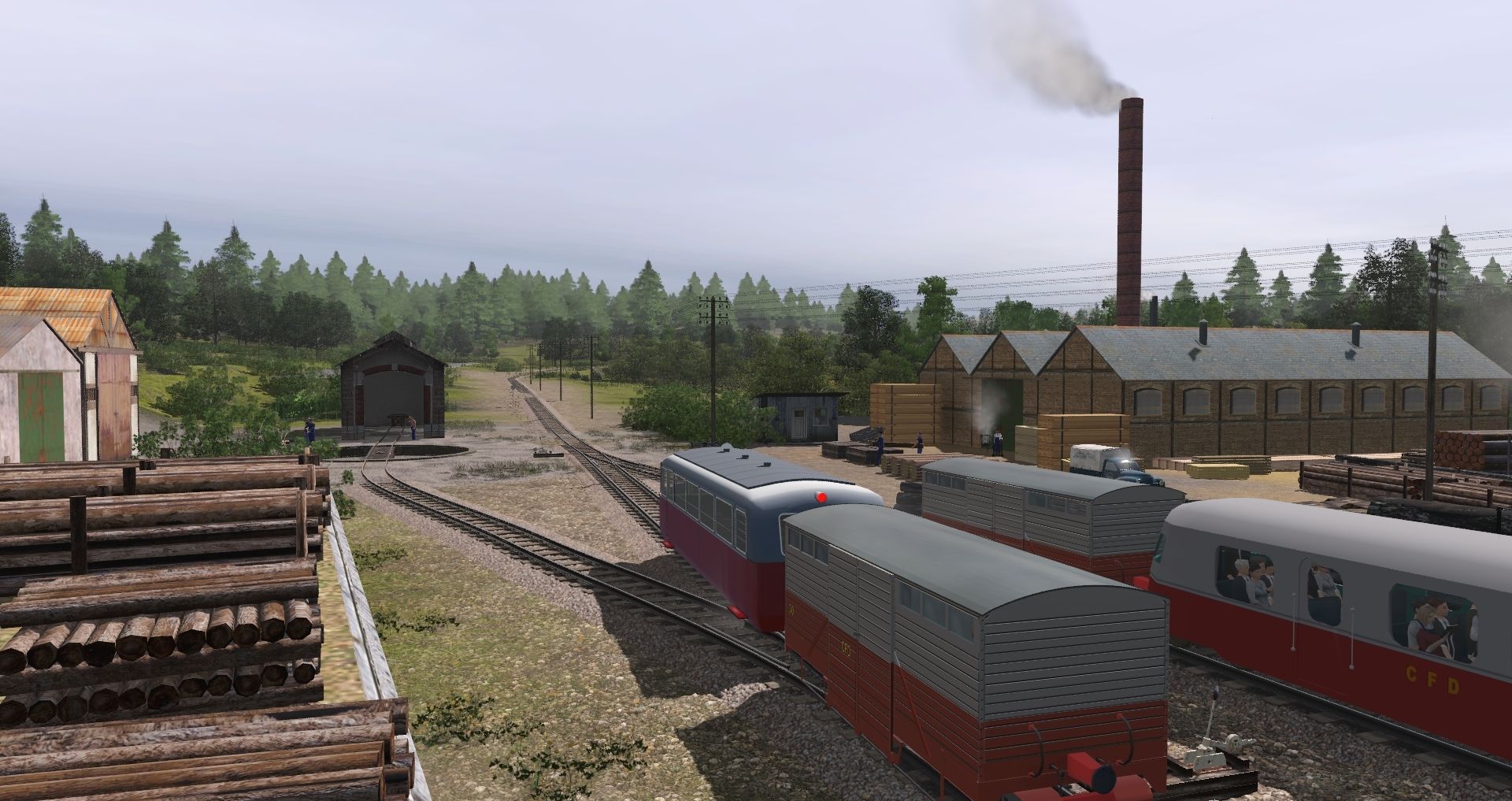 Tags: Trainz Railroad Simulator 2019, Le Cheylard sans textures 1960 bis, Le Cheylard sans textures 1960 bis - Default, CFD_autorail_A80_rouge_et_gris, De Dion Bouton NC, porte_grumes_metrique_CFD_disque, Remorque messagerie Billard, wagon tombereau type G CFD, wagon couvert Kf metrique CFD