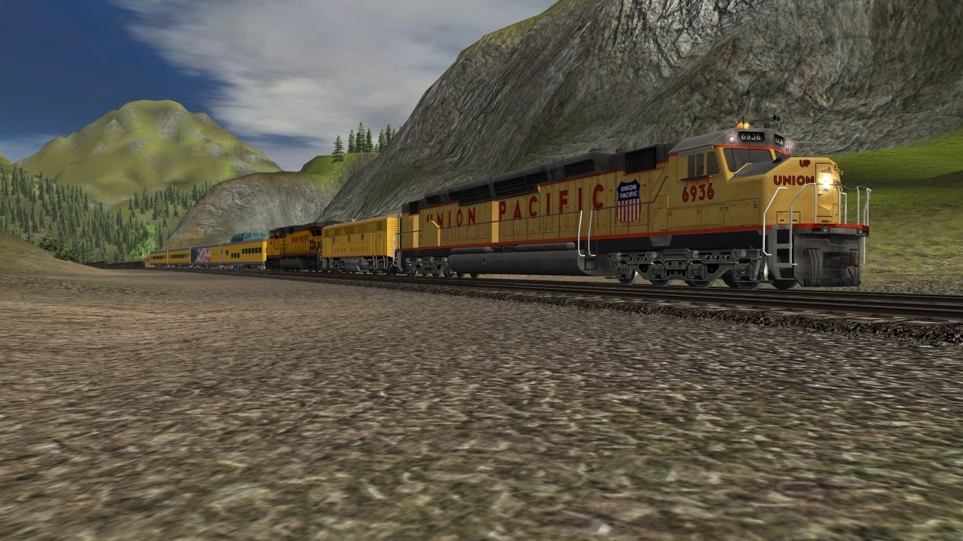 Tags: Trainz: A New Era, Kickstarter County, Default, EMD DDA40X UP Post 1980, UP F3B, UP Dash 9-44CW-Lightning Stripe, UP_dome_observation_9011, UP Baggage 5769 Council Bluffs, UP coach 5451, UP coach 5450