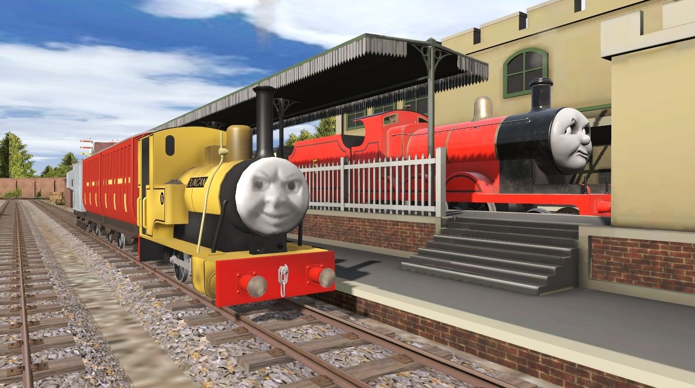 Tags: Trainz Railroad Simulator 2019, Crovans Gate, Flying Cam, Duncan, TTTE - James the Red Engine, Skarloey Railway Coach - Red, Skarloey Railway Brake Van - Blue, TTTE - James's Tender, TTTE - Old Coach 1st Class Composite, TTTE - Old Coach Brake