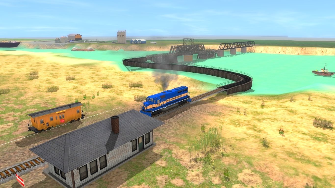 Tags: Trainz: A New Era, Milwaulkee Road Iowa/Illinios Subdivision, DME GP38-3 #3833, Caboose Milwaukee 992165 (BW), Barge Grain Open Cover