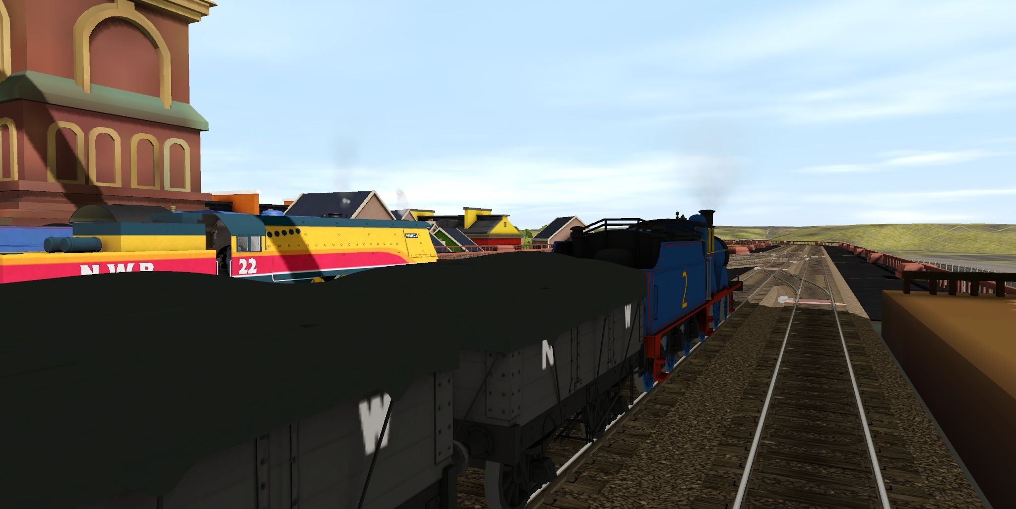 Tags: Trainz Railroad Simulator 2019, CGI - Vicarstown, Flying Cam, RWS 3D - RWS Thomas MK2, RWS Edward (Current Shape - no siderods), CR3D - Rebecca, RWS 3D - RWS Gordon, NWR 4 Plank Wagon Tarpaulin, RWS Edward (Fowler - NWR) Tender, CR3D - Rebecca Tender, NWR Non Vent Van, RWS 3D - Gordon's Tender, NWR Spiteful Brakevan