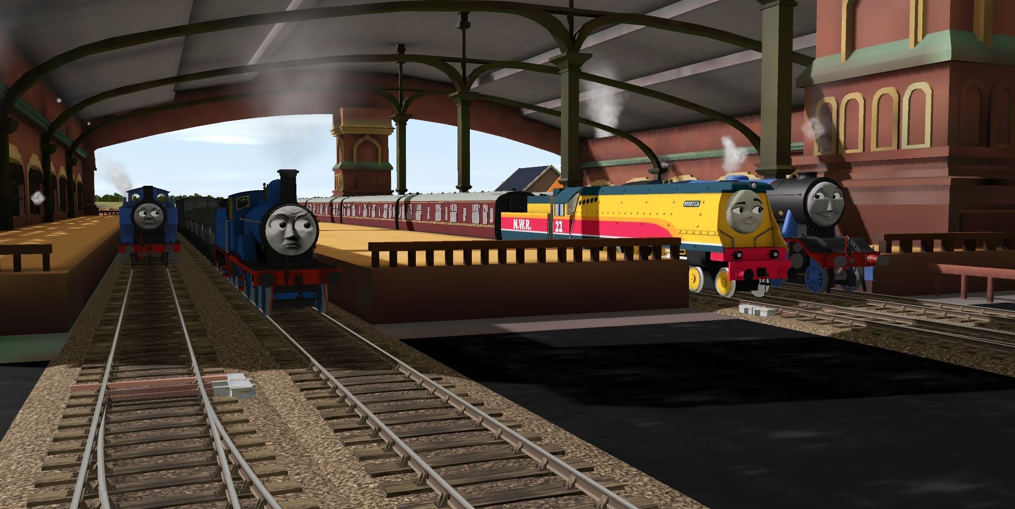 Tags: Trainz Railroad Simulator 2019, CGI - Vicarstown, Flying Cam, RWS Edward (Current Shape - no siderods), CR3D - Rebecca, RWS 3D - RWS Gordon, RWS 3D - RWS Thomas MK2, RWS Edward (Fowler - NWR) Tender, CR3D - Rebecca Tender, RWS 3D - Gordon's Tender, NWR 4 Plank Wagon Tarpaulin, NWR Non Vent Van, NWR Spiteful Brakevan