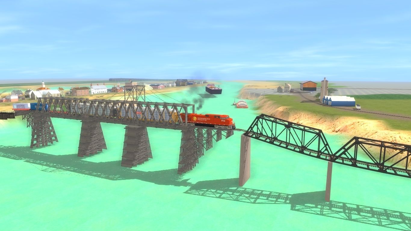 Tags: Trainz: A New Era, Milwaulkee Road Iowa/Illinios Subdivision, Canadian Pacific Dash 9 ARN, Autorack TTGX - CP Rail Logo, Autorack TTGX Canadian National #, Container Flat Evergreen 21, Container Flat Hanjin 14, Container Flat Maersk Sealand 26, Barge Grain Open Cover