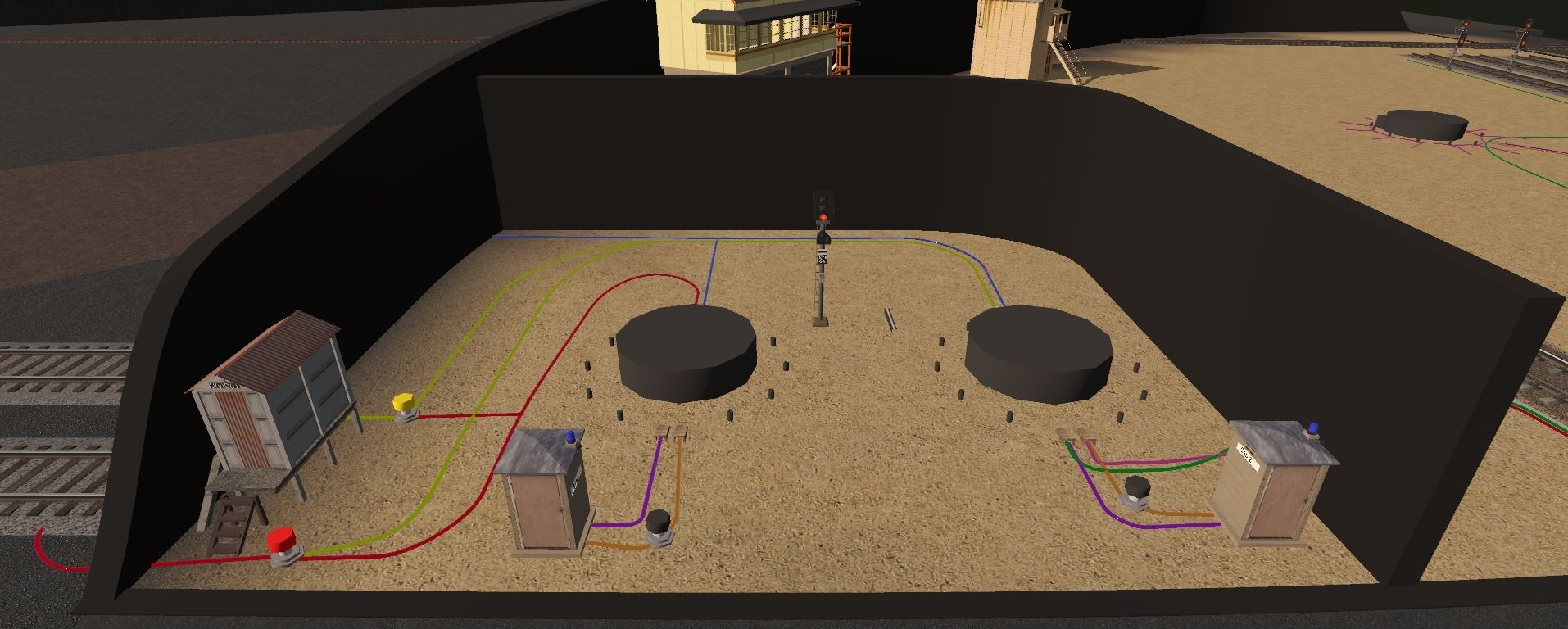 Caption: Model Railway Wiring - 2 Cab Operation on any track. Cab 1 (left). Cab 2 (right). Red & Yellow Wires = Feed. Blue Wire = Common Return. DC