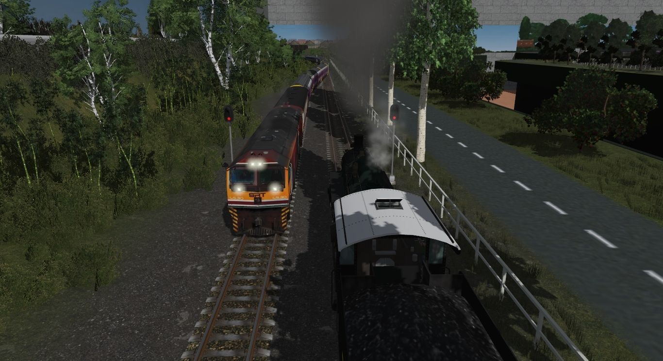 Caption: SRT Baldwin Steam's ordinary passenger train is waiting for SRT GE CM22-7i (GEA) 4530's special express train on my model railway.