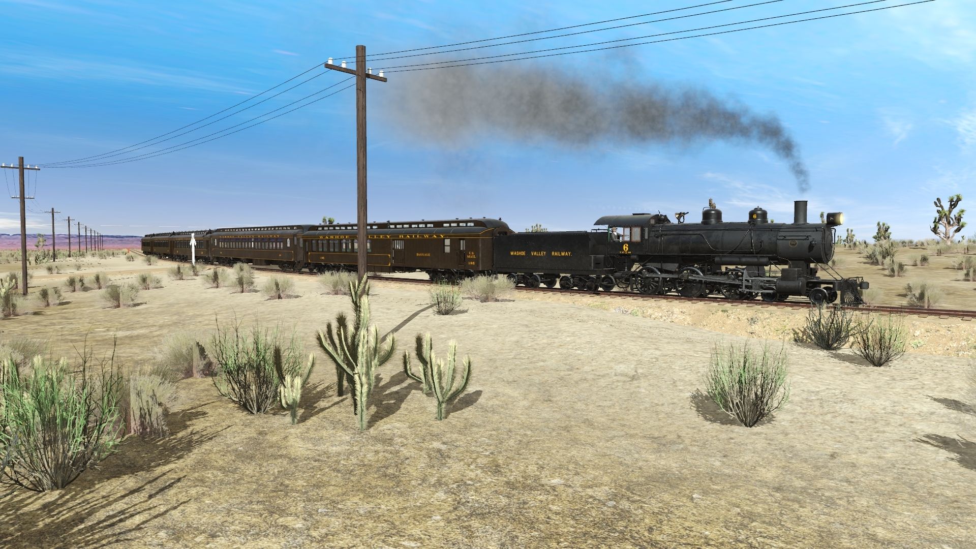 Tags: Trainz Railroad Simulator 2019, Mojave Crossing, Desert Drive, WVRR No. 6(2) Ca. 1930s, WVRR No. 6(2) Tender Ca. 1930s, WVRR 135 Series Combine Ca. 1930s, WVRR 188 Series Coach Ca. 1930s, WVRR 225 Series Chair Car Ca. 1930s, WVRR 170 Series Coach Ca. 1930s