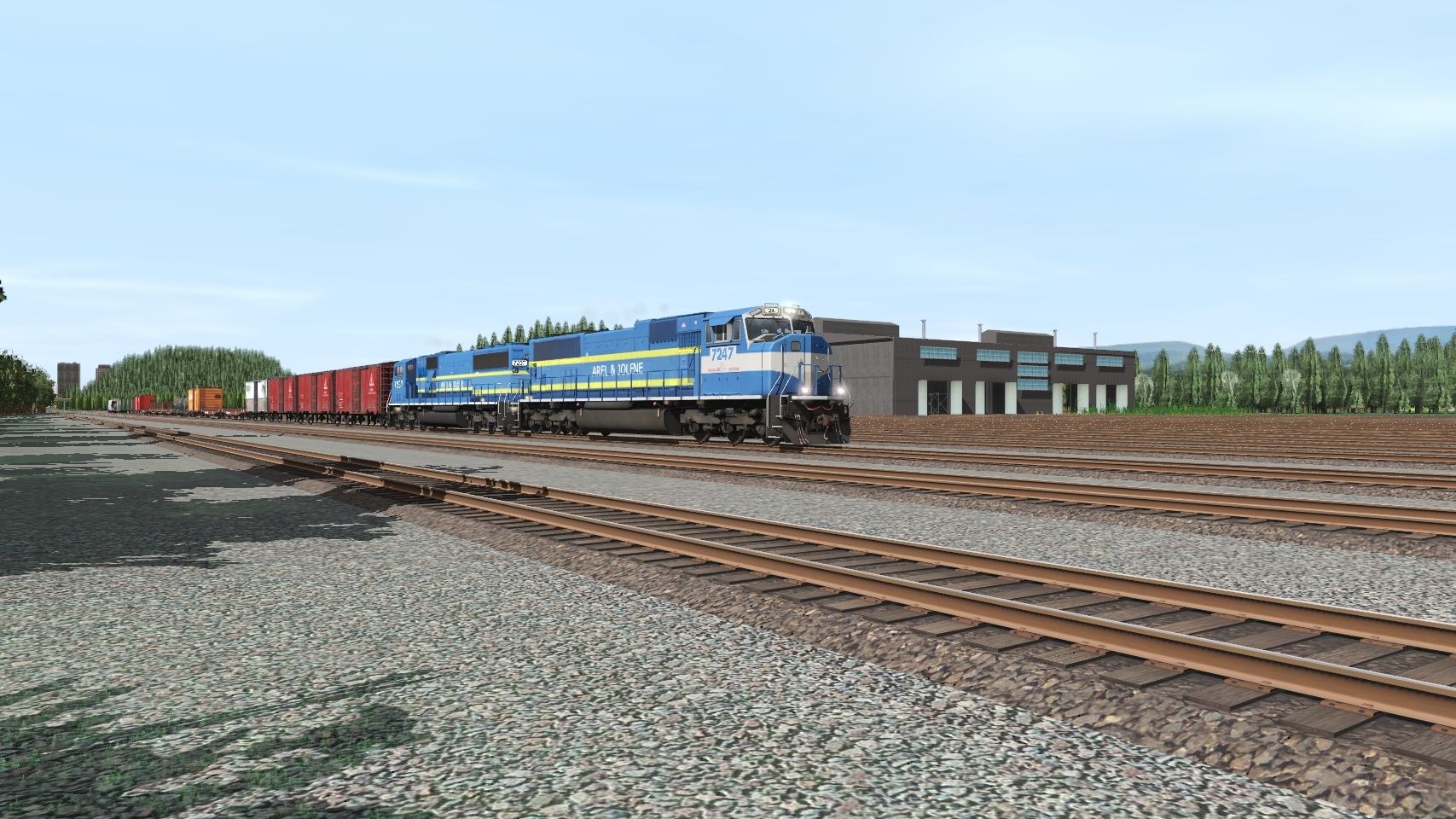 Tags: Trainz Railroad Simulator 2019, Arel and Jolene Railroad, Downtown test, A&J SD70MAC, A&J SD60M, Custom 40' Boxcar - #1, Custom 40' Boxcar - #6, BNSF Flat car 917504, Custom 40' Boxcar - #5, Tanker 40ft UTLX #, Log Wagon Short Knuckle, Custom 40' Boxcar - #8, Custom 40' Boxcar - #3, Custom 40' Boxcar - #2