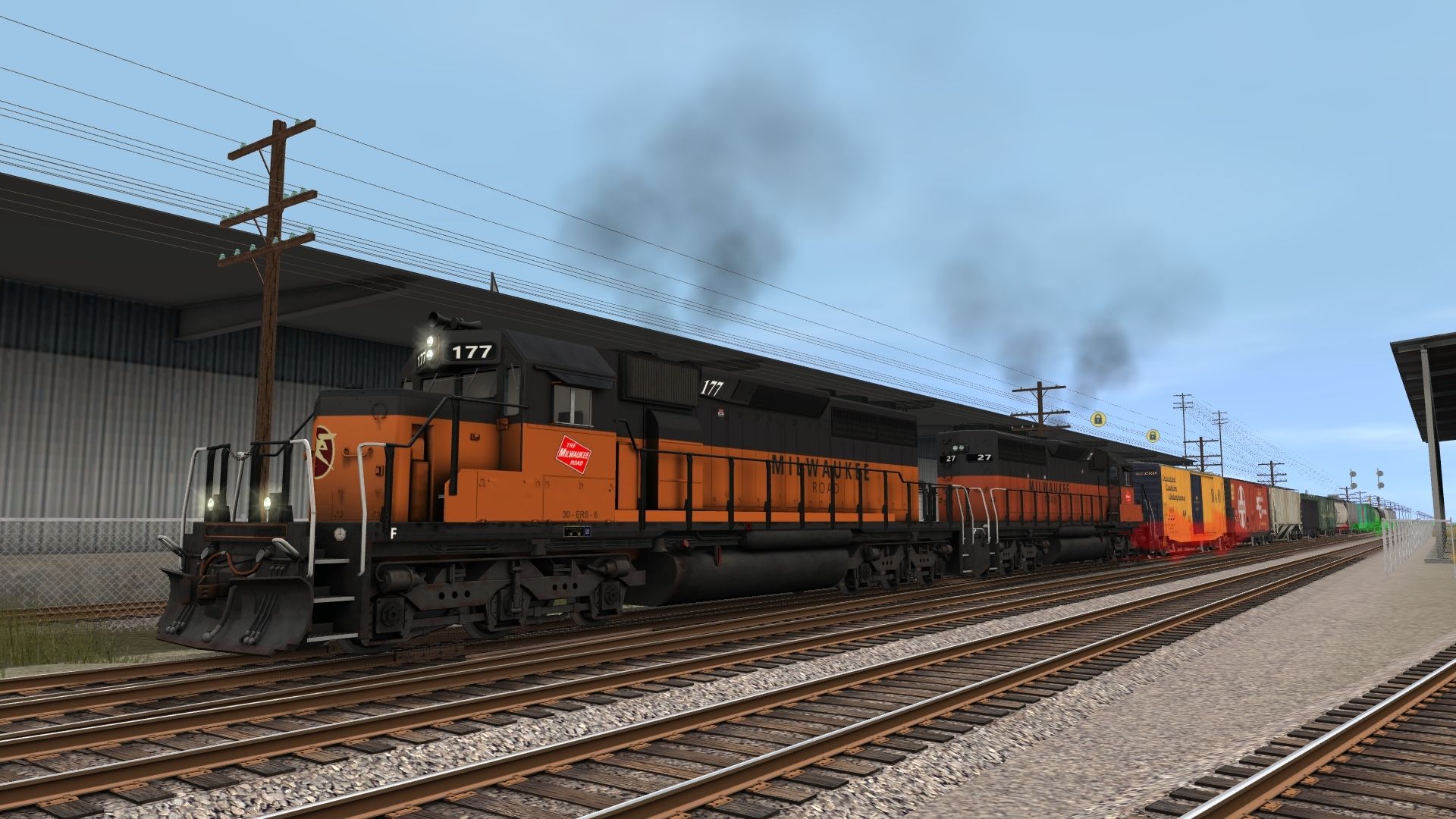 Tags: Trainz: A New Era, Cold Creek Logistics, Cold Creek Logistics - Default, MILW Road SD40-2 #177 HP, MILW Road SD40-2 #27 HP, MILW Road SD40-2 #23 HP, UB SW1500, B&O 50' PS-1, ATSF 50' PS-1, UP Trinity 3 Bay Hopper, PRR 100 Ton Hopper, NP 50' RBL, MWGX (dirty) Cylindrical Hopper, JRPX LO 4750 3 bay