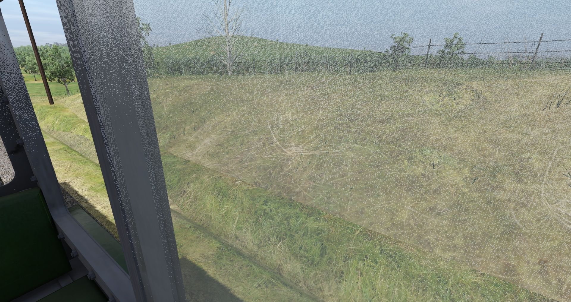 Caption: VR V Class 2 Tone TRS19 Locomotives and session, veiw from cab with drivers window open, has misty effect?
