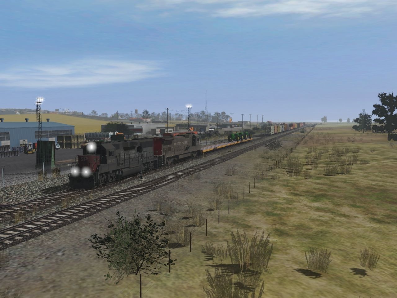 Tags: Trainz Railroad Simulator 2019, Brownwood Secondary Texas, Day 1, EMD GP60 SP #9737, SP B39-8E 8019, CELX 23000 gal Funnel-Flow tank car, BN 62Ft. Bulkhead (early era), 89ft Flatcar ITTX #911285-r, 60ft Boxcar ATSF #524320-r, 89ft Flatcar ITTX #912048-r, 2Bay ACF CovHopper Rio Grande-rev, 2Bay Cov Hop SP 402302-rev, 2Bay Airslide Hopper Corn Products CCLX-rev, 2Bay Airslide Hopper Bay State Milling Co GACX eMFX#