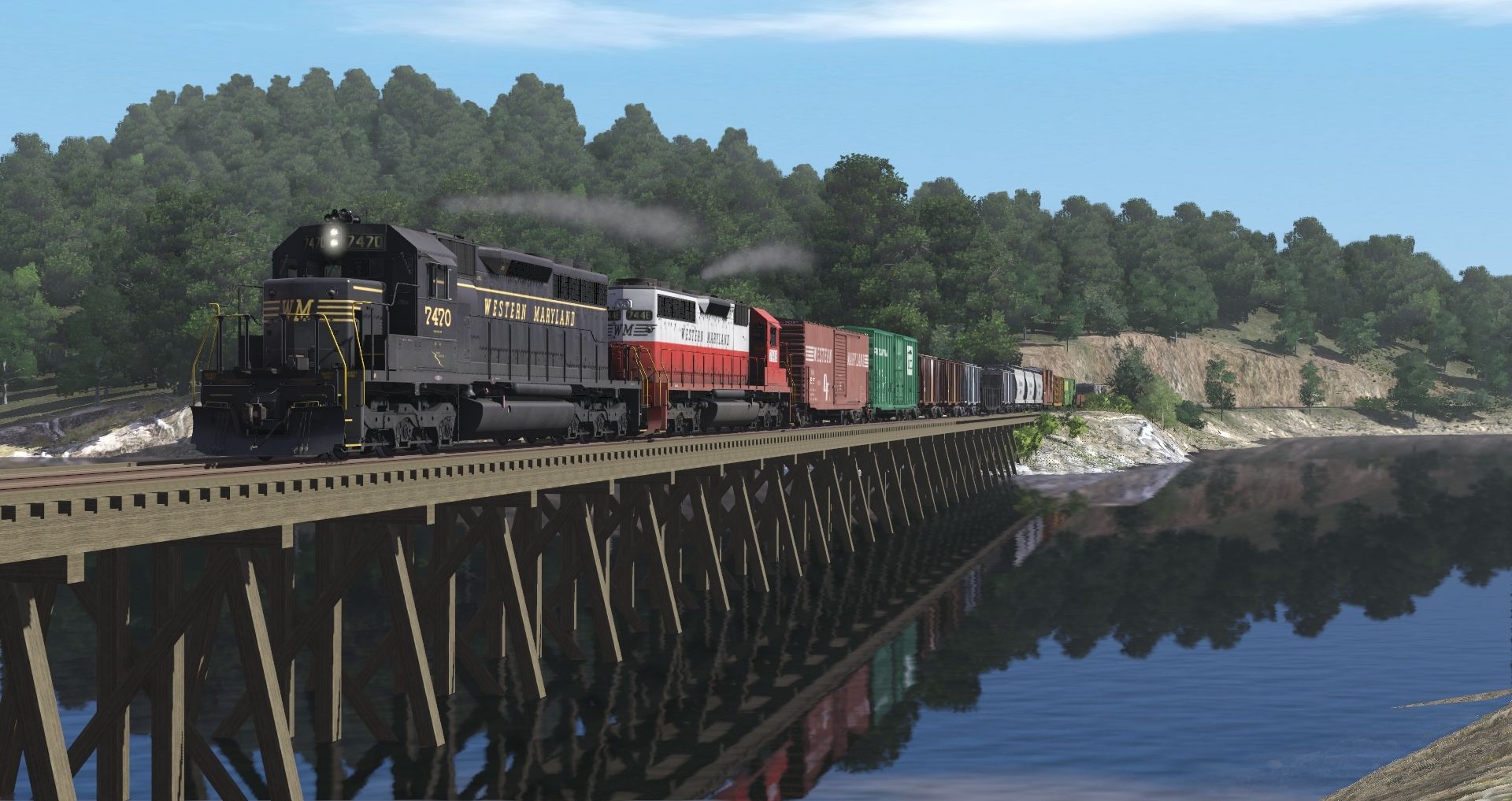 Tags: Trainz Railroad Simulator 2019, riverfront, Default, WM SD40 black, WM SD40, WM 50' ACF Boxcar, 50ft Boxcar PENN CENTRAL pd#, WVRR LO 2003 - Borax/Soda Service, WVRR LO 2003 - Sand/Aggregate Service, Western Maryland LO 2003, WP Greenville Gondola, SSW PS 2bay LO hopper, SP 2 Bay Hopper ACF 2971, SP PC&F 6033
