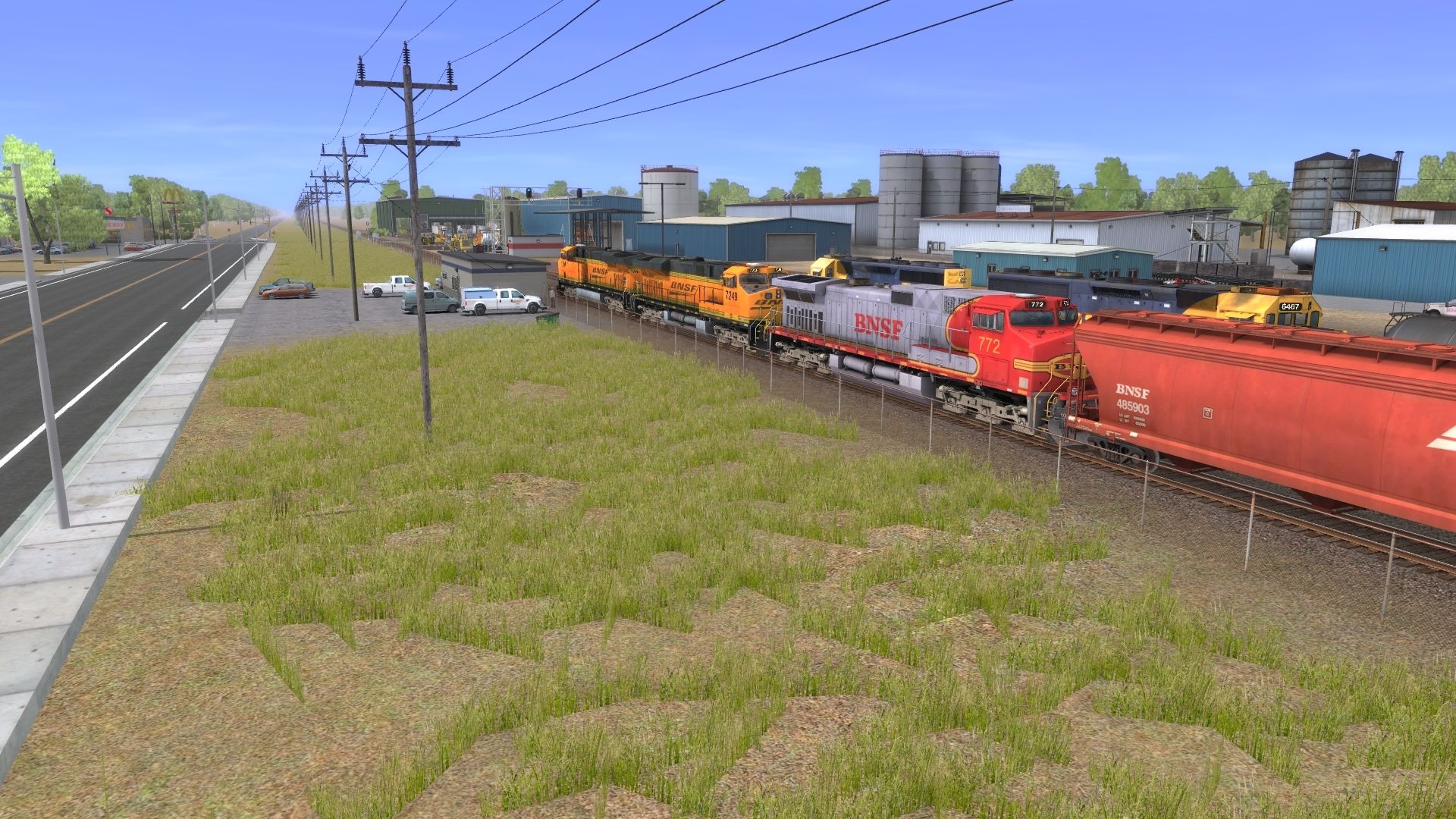 Tags: Trainz: A New Era, Red Oak Sub, BNSF C44-9W WB, BNSF SD45-2u patch, BNSF/ATSF Patch SD40-2, BNSF ES44DC Dirty 1, SSP 110 SW, [S86] - MTT Harsco Mark IV, Shop clutter Genset platform no generators undec, UTLX LPG Tank (Modern), T108 NATX 303300-303528 TRN 30120 gal, AP53 TTX Wellcar B, BNSF Centerflow 3 Bay long hatch Swoosh