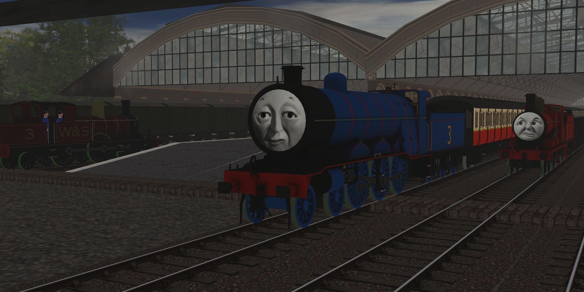 Tags: Trainz Railroad Simulator 2019, (STW3D) RWS Vicarstown, Flying Cam, RWS Henry (Original Shape - NWR Blue Square Buffers), RWS James (NWR), W&S #3 - Adam, RWS Henry Tender (Original Shape - NWR Blue Square Buffers), TTTE - S2 Express Composite Coach, RWS James (NWR) Tender, TTTE - S2 Express Brake Coach, TRW - LNER 12T Van (S8 - Onwards), TRW - 7 Plank Wagon, TRW - GWR Cattle Van