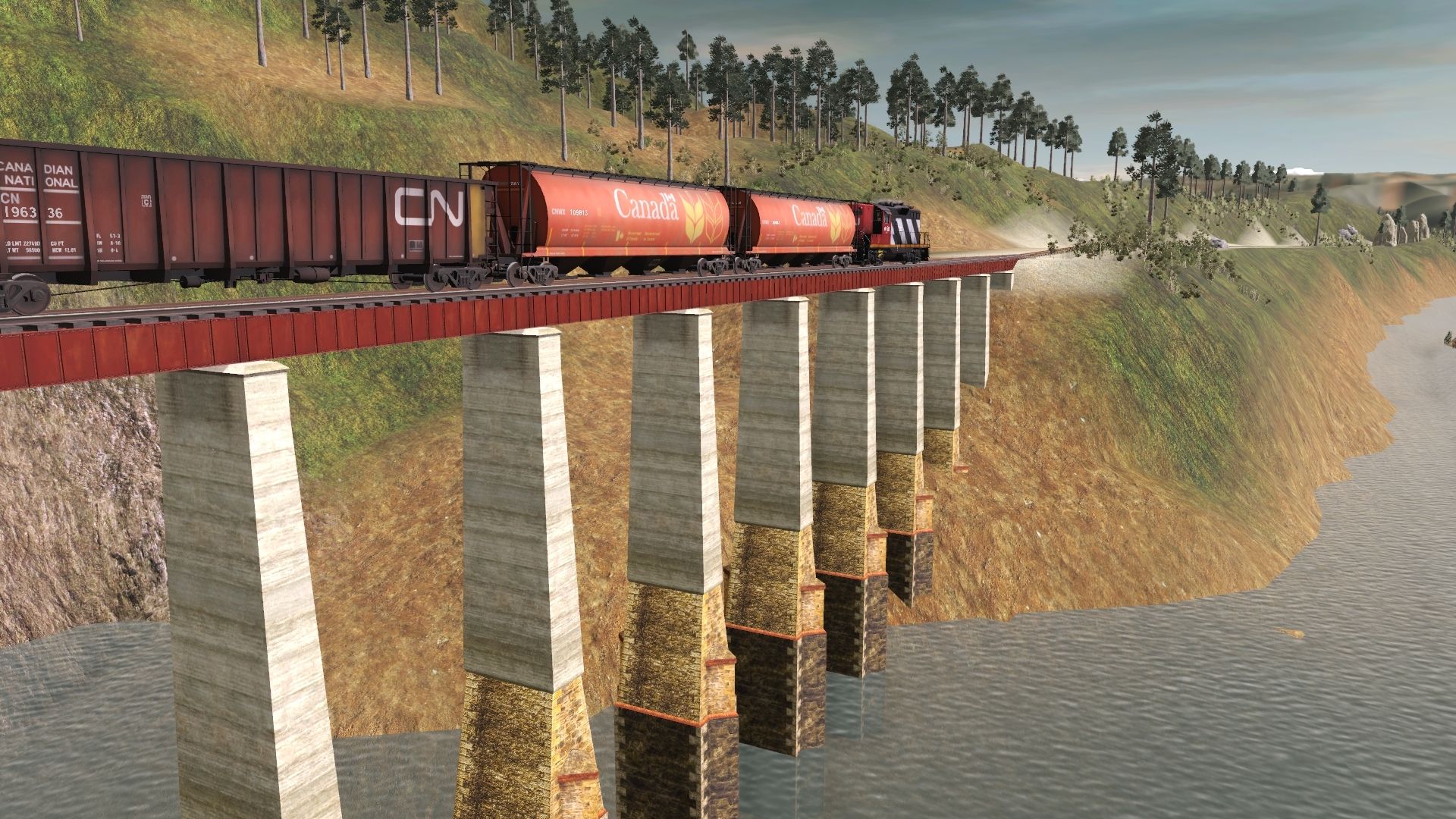 Tags: Trainz Railroad Simulator 2019, Kickstarter County 2, CN GP9 phase II (zebra), CN 4000cf Rotary Gondola, CN 50' ACF Boxcar 2, CNWX Cylindrical Hopper, CN 50' ACF Boxcar 3, CN 50' ACF Boxcar 1, CN 61Ft Woodchip Gondola